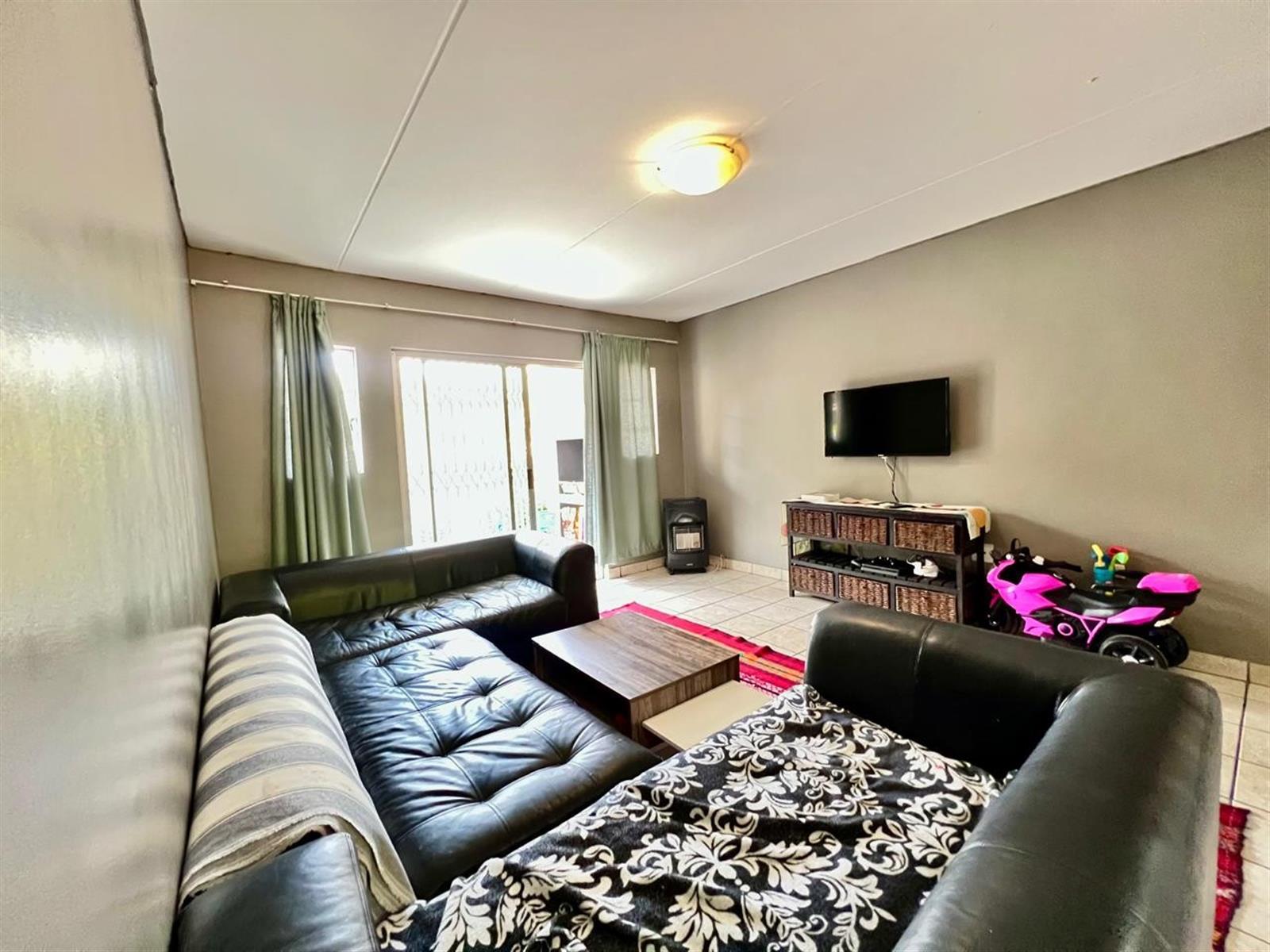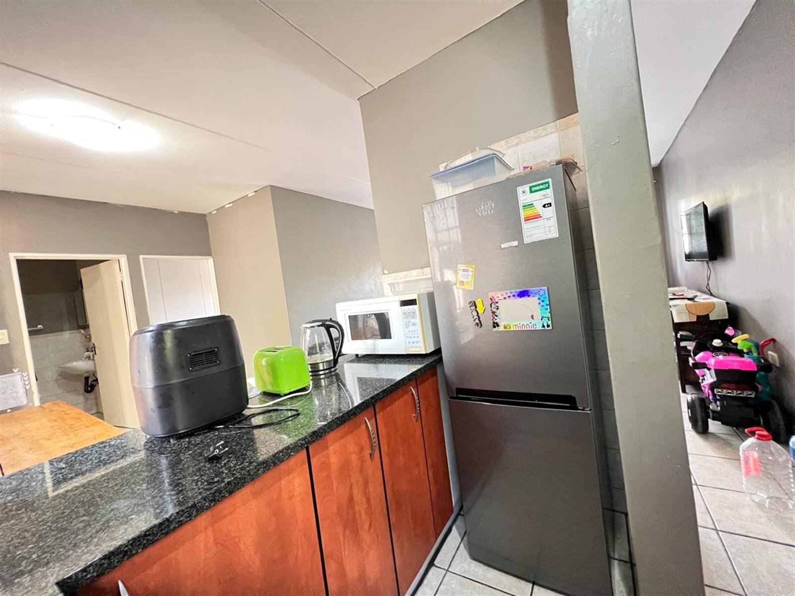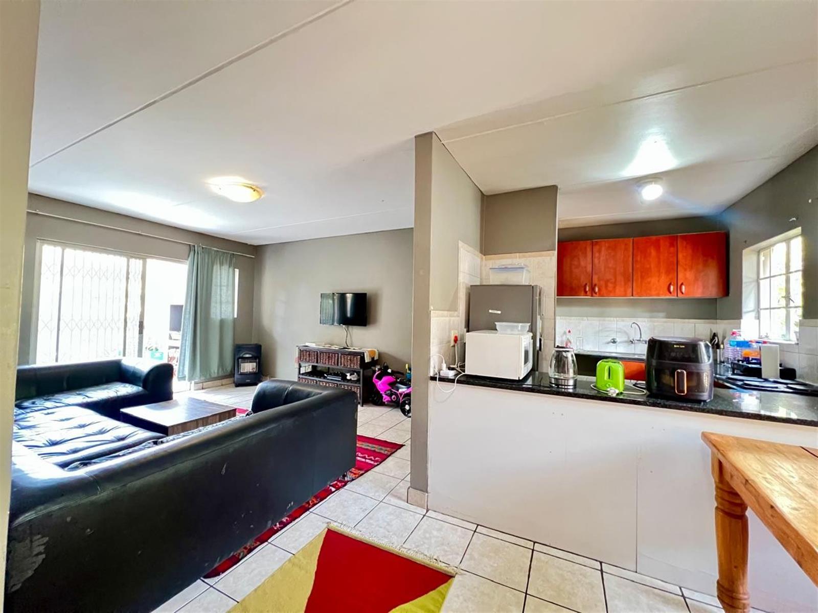 The apartment boasts a spacious open-plan layout with a living room, dining area, and kitchen designed for easy living. The kitchen offers ample cupboard space and fittings for a washing machine and single-door fridge.