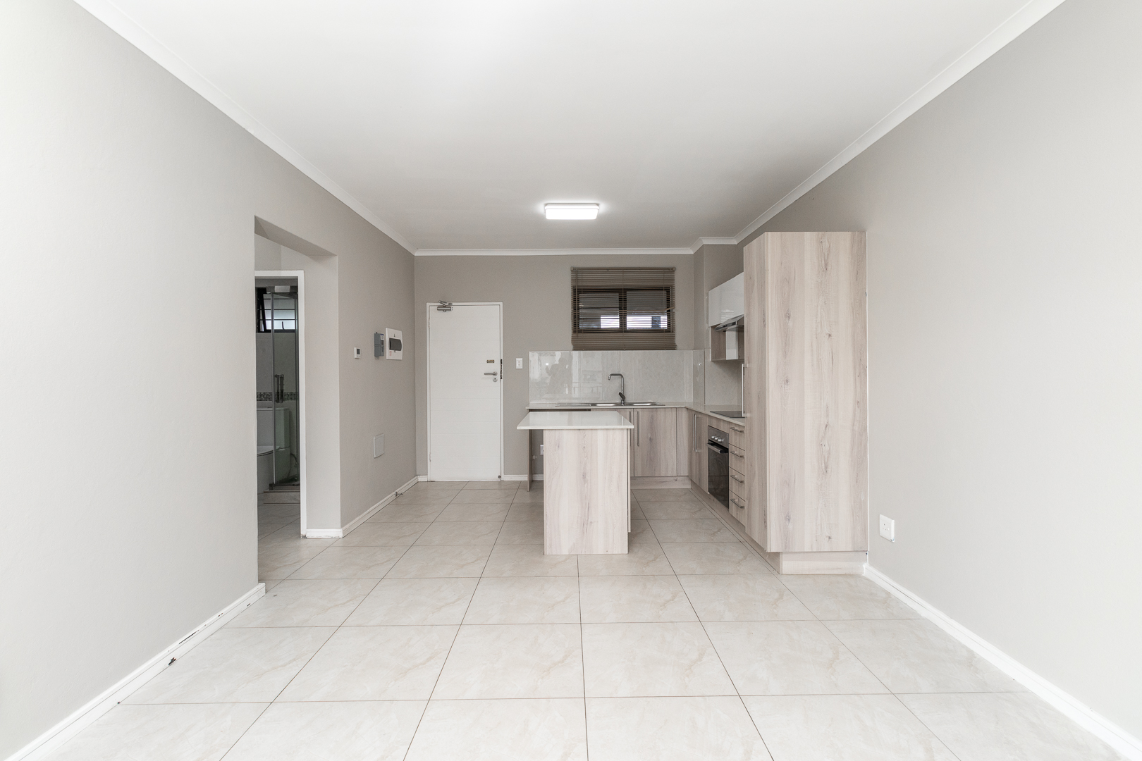The neat, open-plan kitchen flows easily into a spacious dining room/lounge, which leads onto a wide balcony. There is plenty of cupboard space in the kitchen which includes an island, and space for a standard-sized fridge and one under-counter appliance.