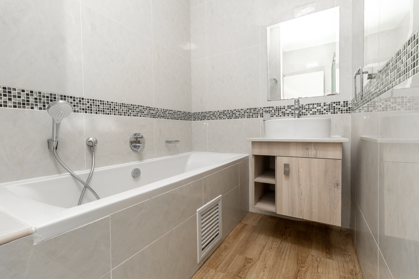 The bedroom offers ample built-in cupboard space and is large enough to fit a king-sized bed. The bathroom includes both a bath and separate shower.