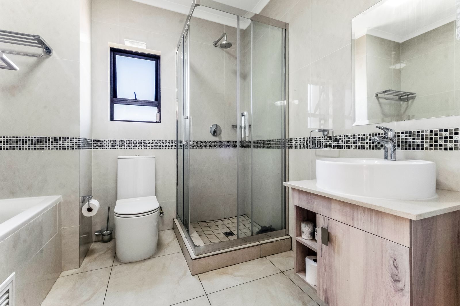 The two generously sized bedrooms with modern built-in cupboards can fit queen sized beds and a full bathroom, equipped with a bathtub and shower.