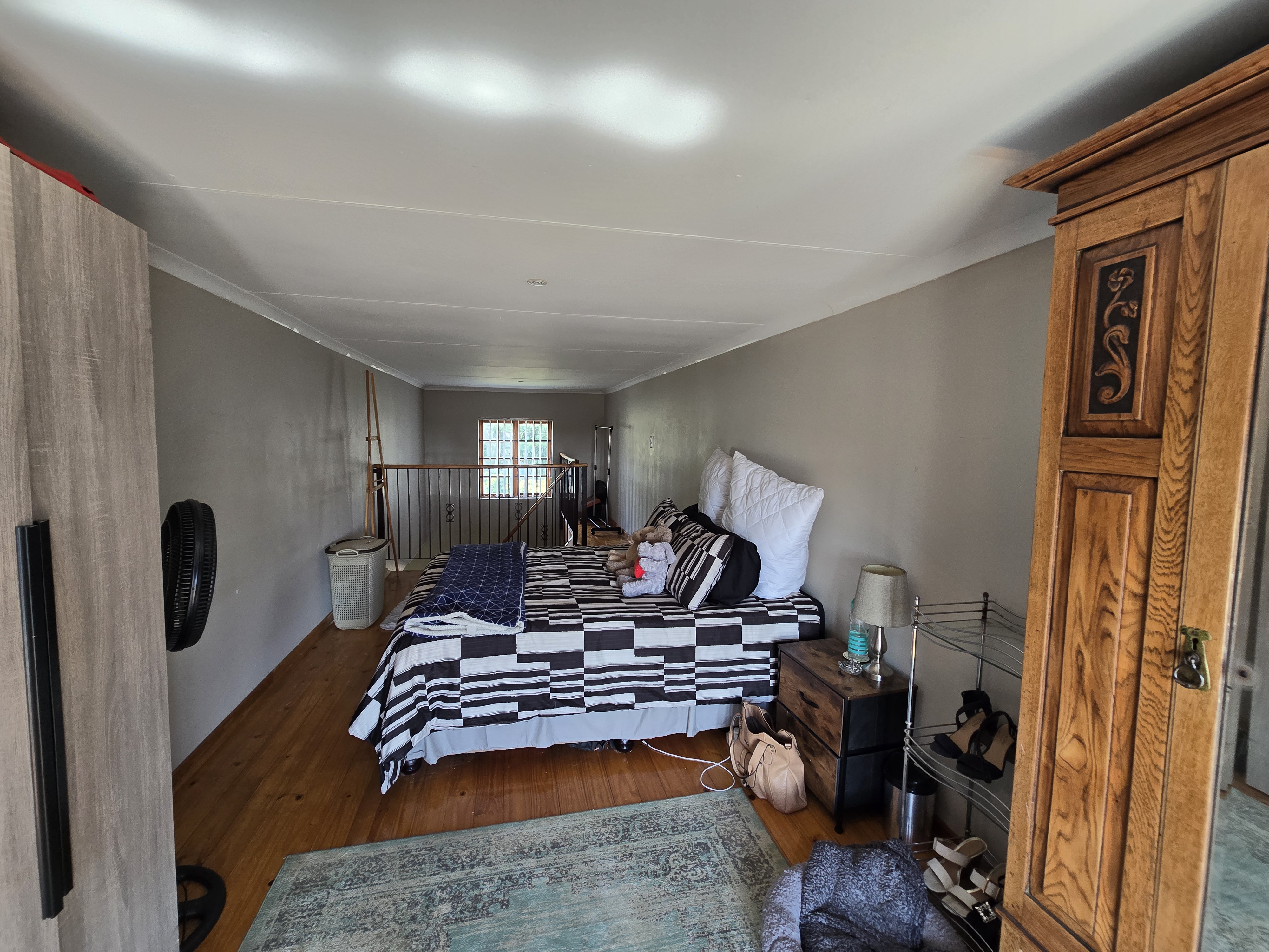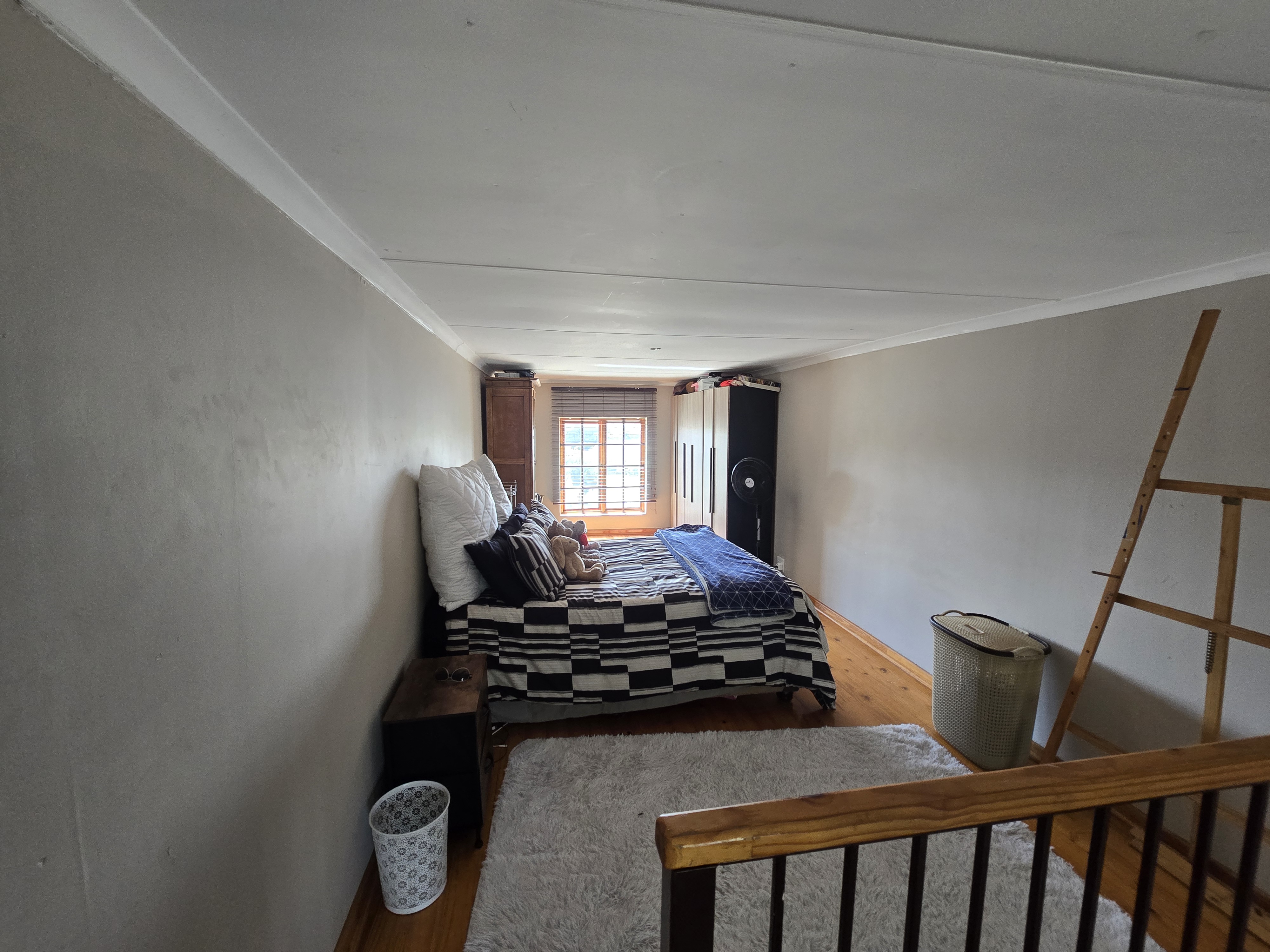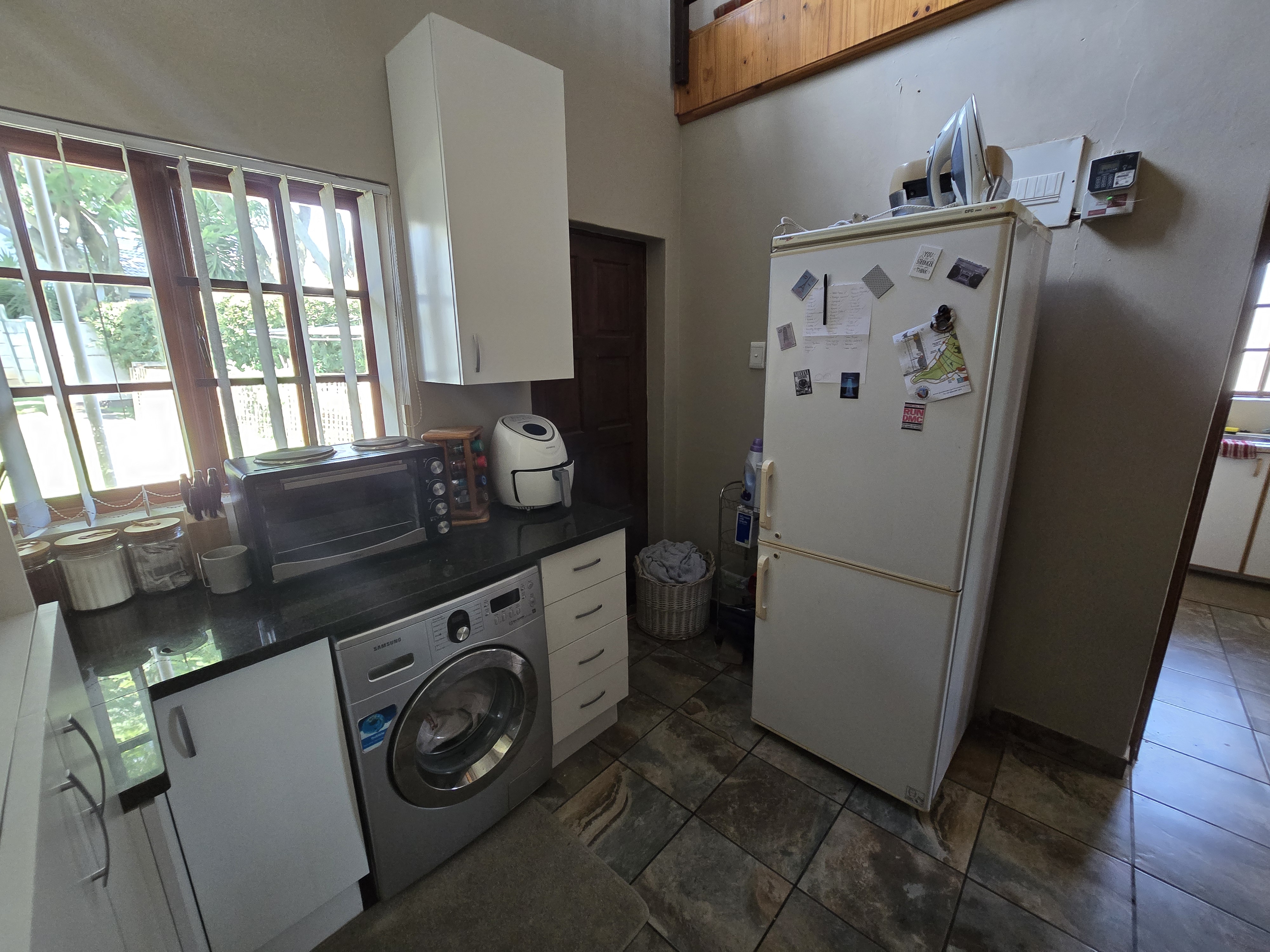 Downstairs is a spacious lounge/ living area that leads into the kitchen. The loft can be used as a bedroom or a study, offering a beautiful sunset view. Parking for one car is available.