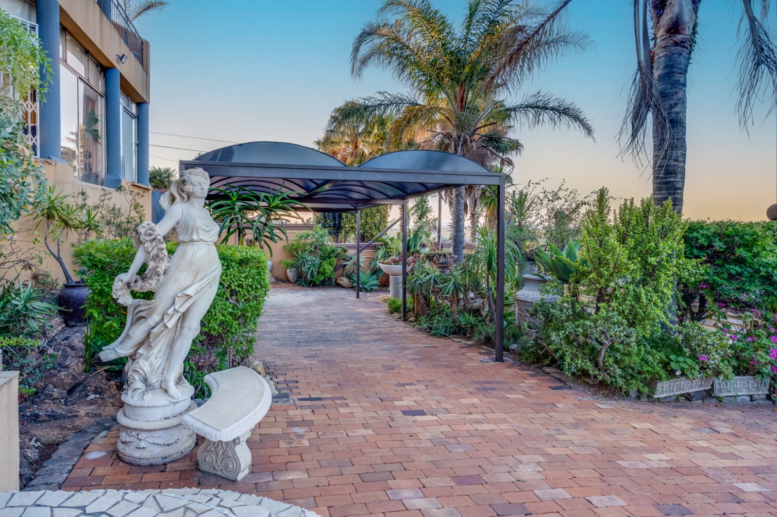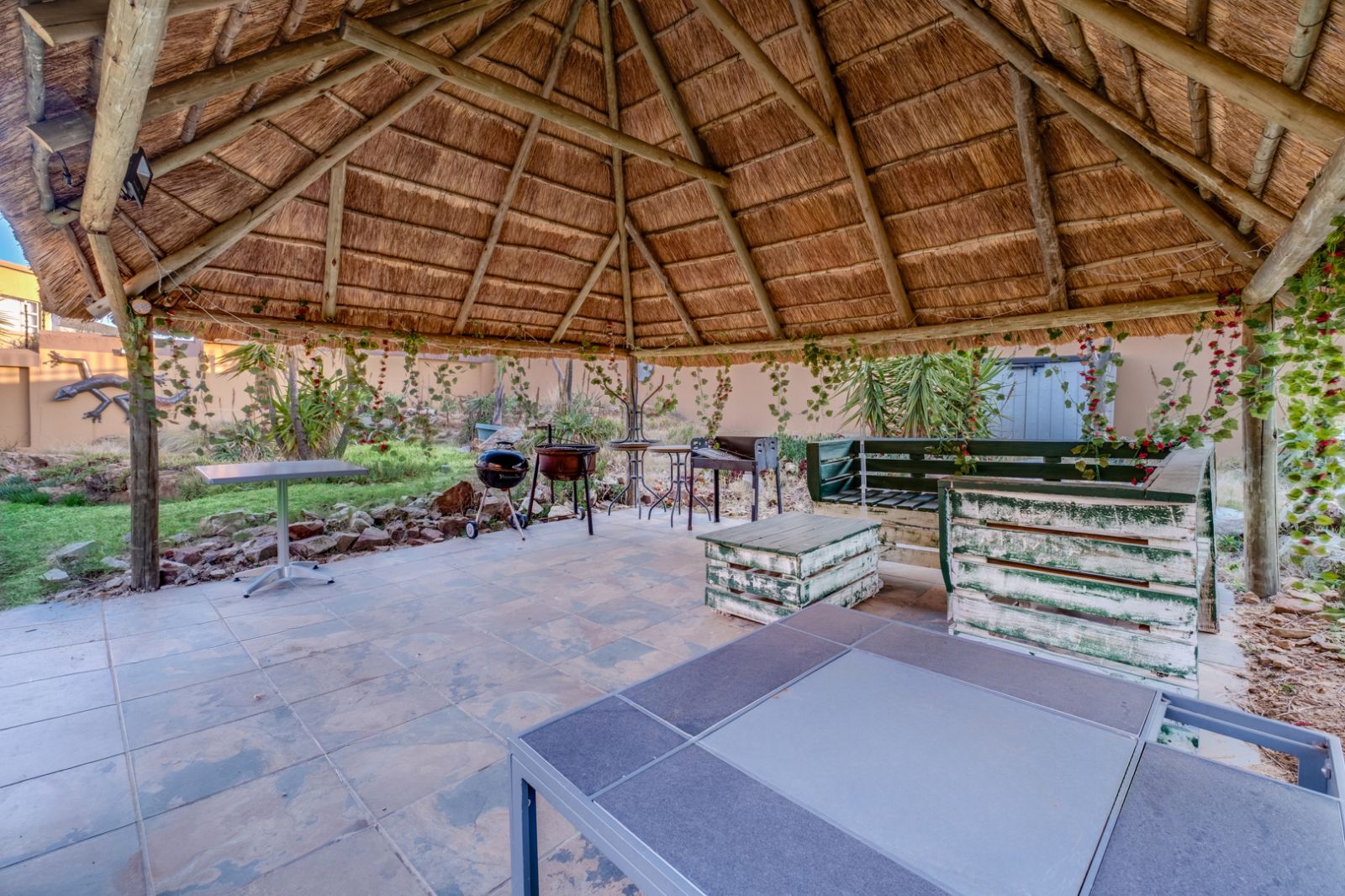 Practicality meets sustainability with solar panels that provide energy efficiency and peace of mind, while the double garage and four-car carport ensure ample parking and convenience for the modern family. There are two Wendy Huts of which one has been converted into a helpers quarters with its own shower and toilet and the second one adds extra value, serving as additional storage or a creative utility space for hobbies or gardening.