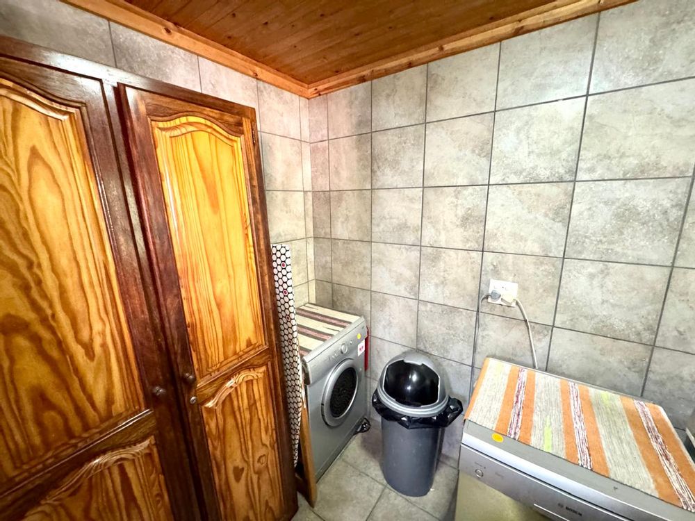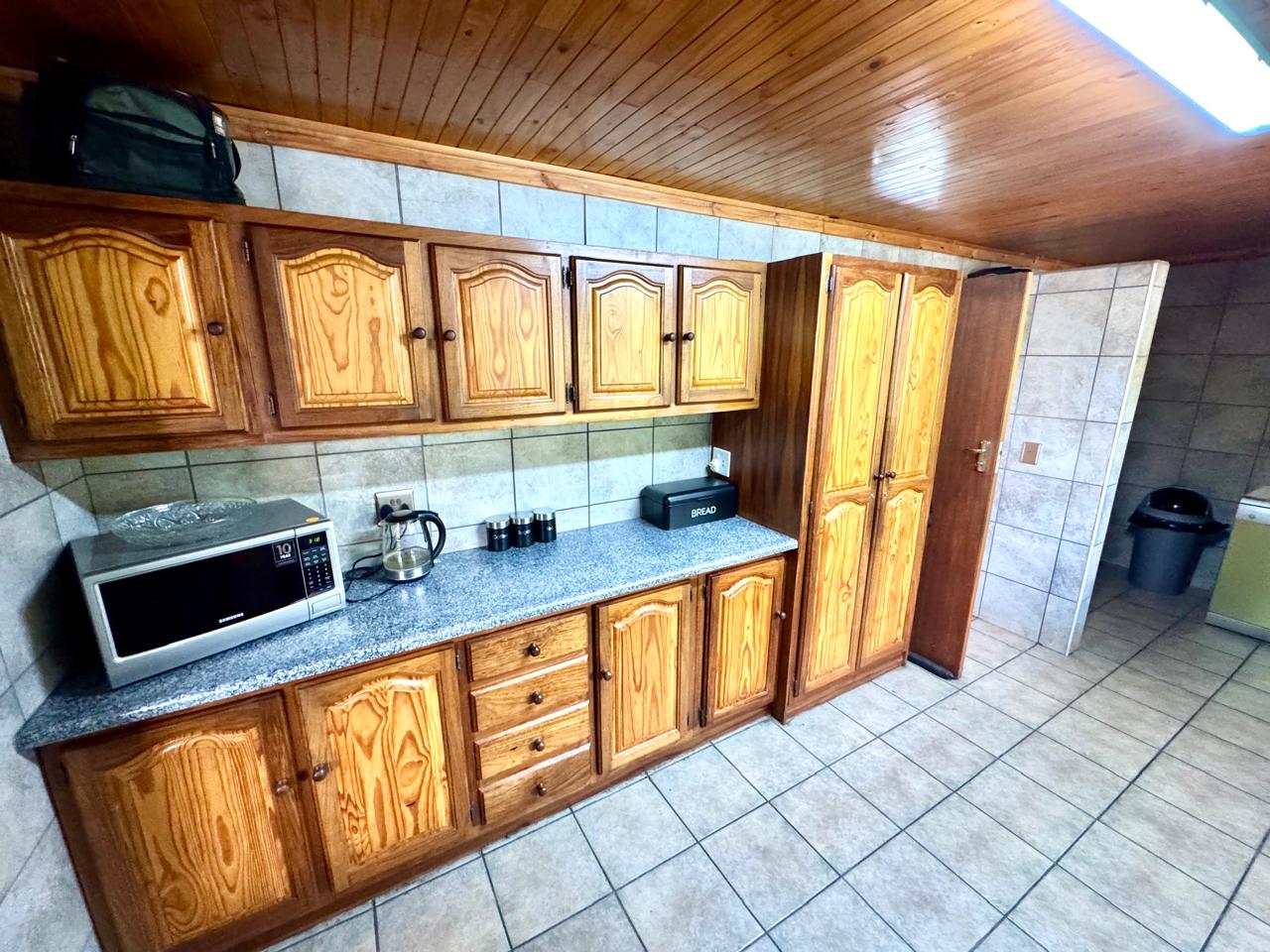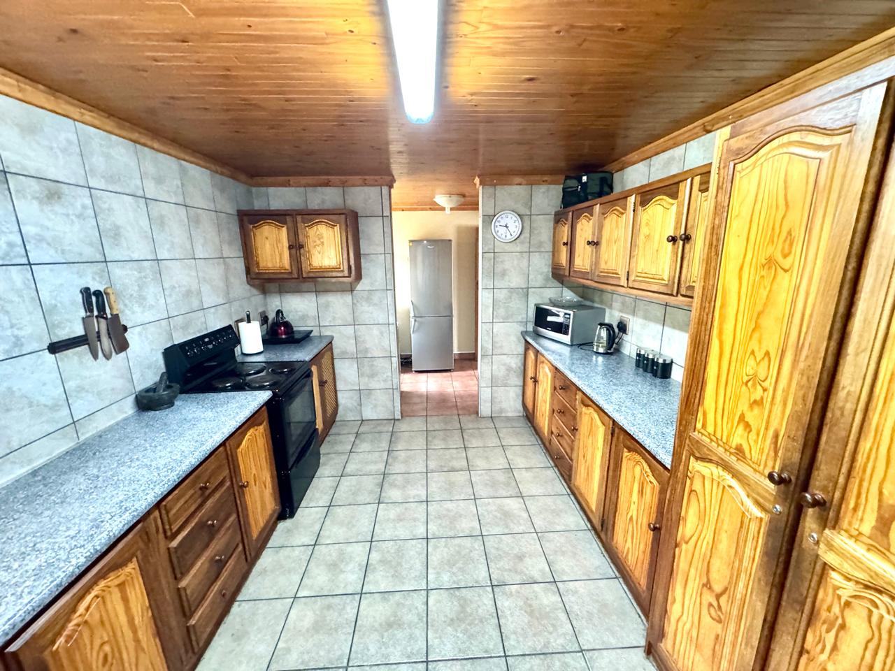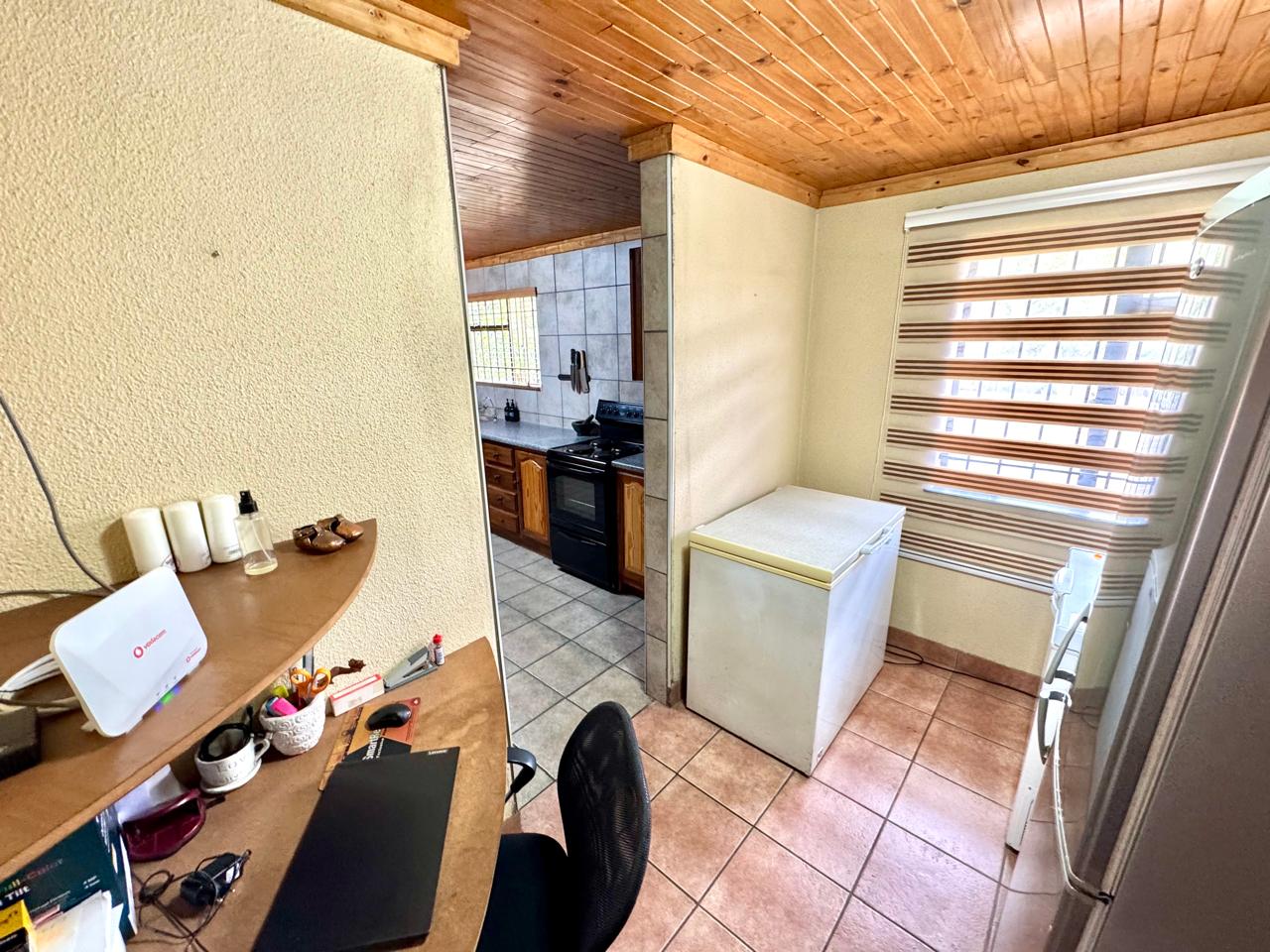 The kitchen is fitted with solid wooden cupboards, melamine countertops, and a standard electric stove and oven. A separate scullery area provides all the necessary connection points for a washing machine, ensuring practicality and convenience. Adjacent to the kitchen is an additional space currently used as a study, offering flexibility for a home office or hobby area.