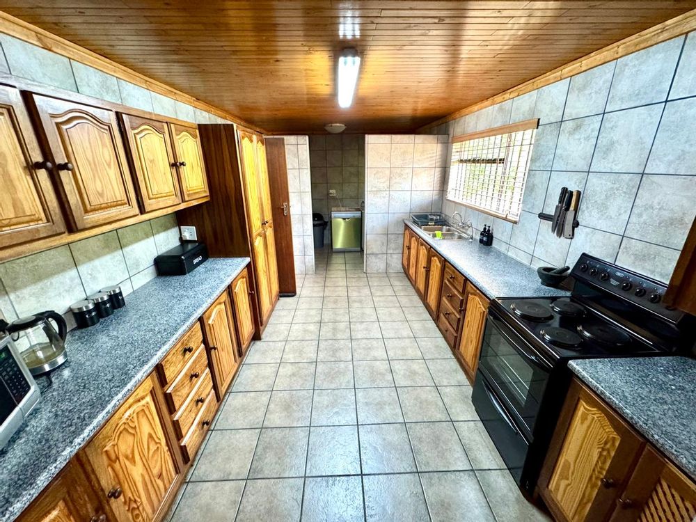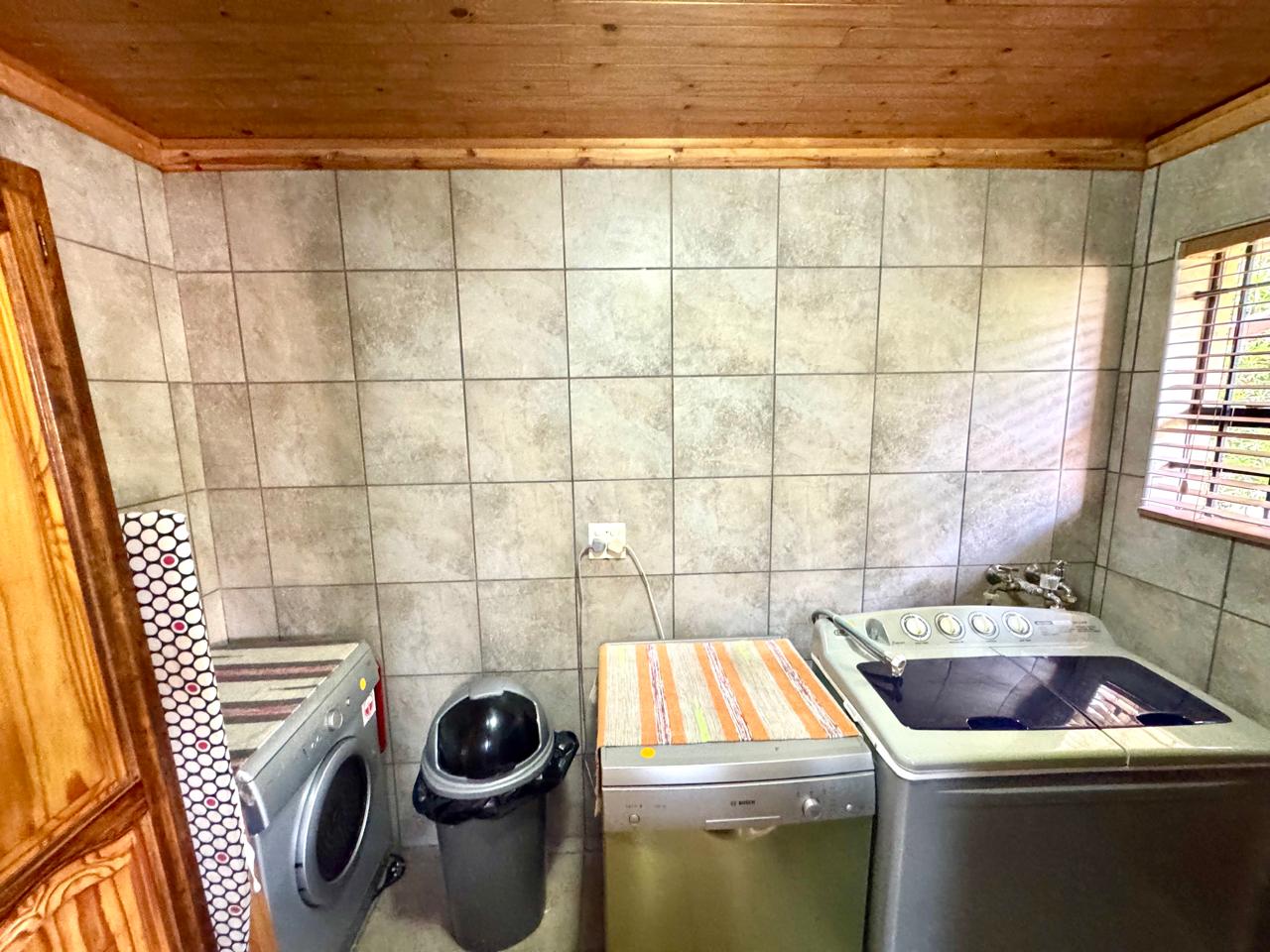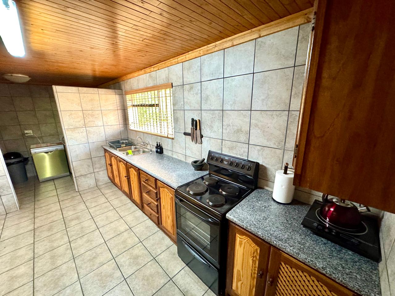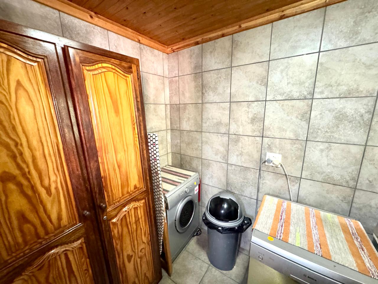 The kitchen is fitted with solid wooden cupboards, melamine countertops, and a standard electric stove and oven. A separate scullery area provides all the necessary connection points for a washing machine, ensuring practicality and convenience. Adjacent to the kitchen is an additional space currently used as a study, offering flexibility for a home office or hobby area.