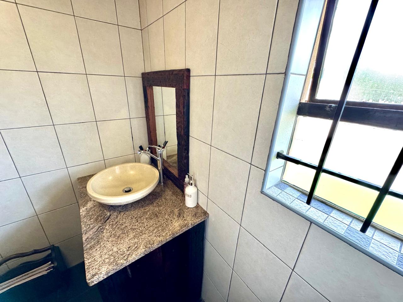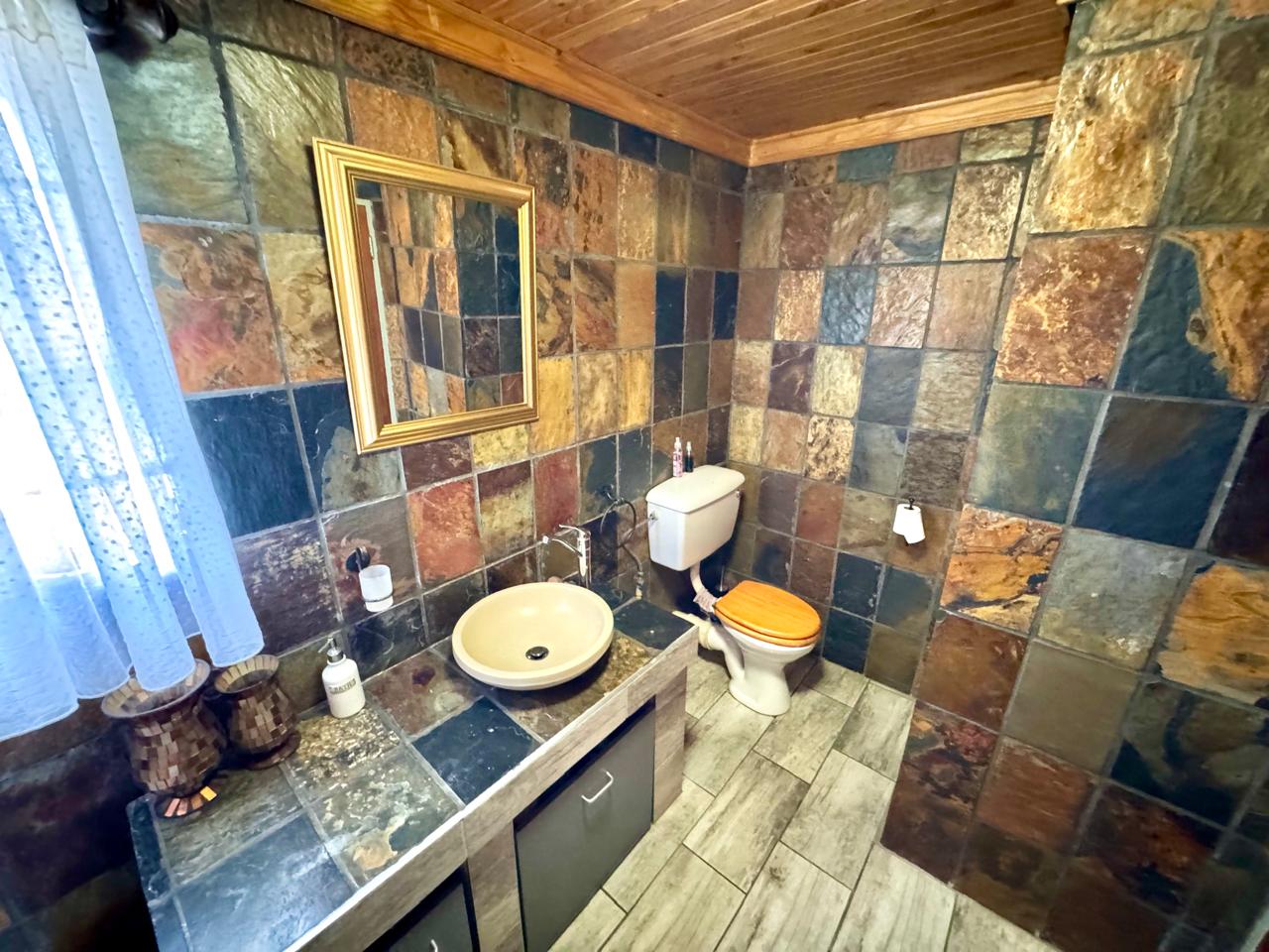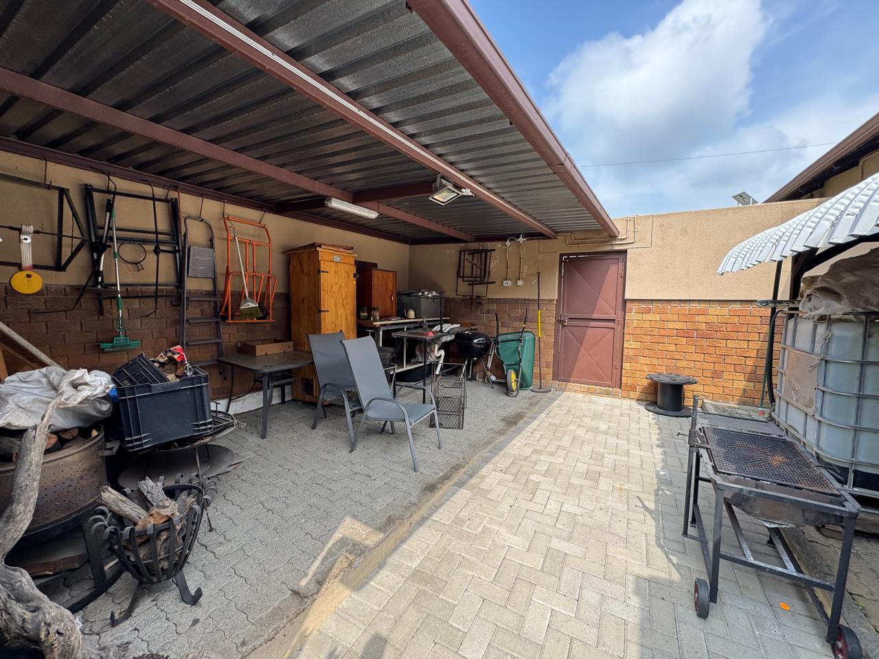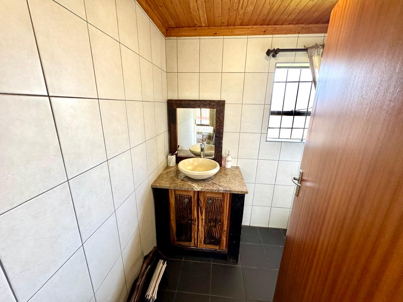 The kitchen is fitted with solid wooden cupboards, melamine countertops, and a standard electric stove and oven. A separate scullery area provides all the necessary connection points for a washing machine, ensuring practicality and convenience. Adjacent to the kitchen is an additional space currently used as a study, offering flexibility for a home office or hobby area.