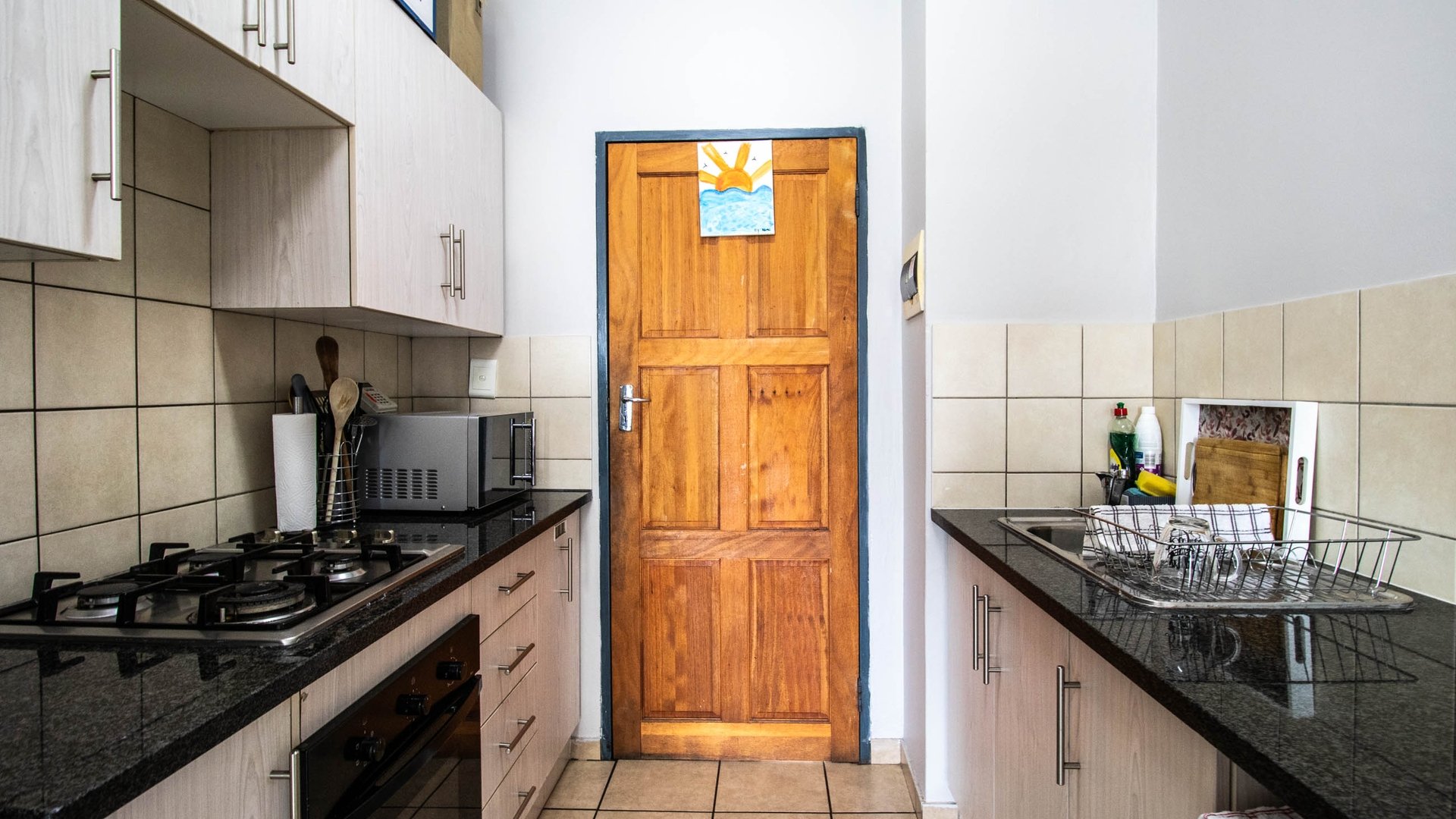 - Gas hob, electric oven, space for washing machine