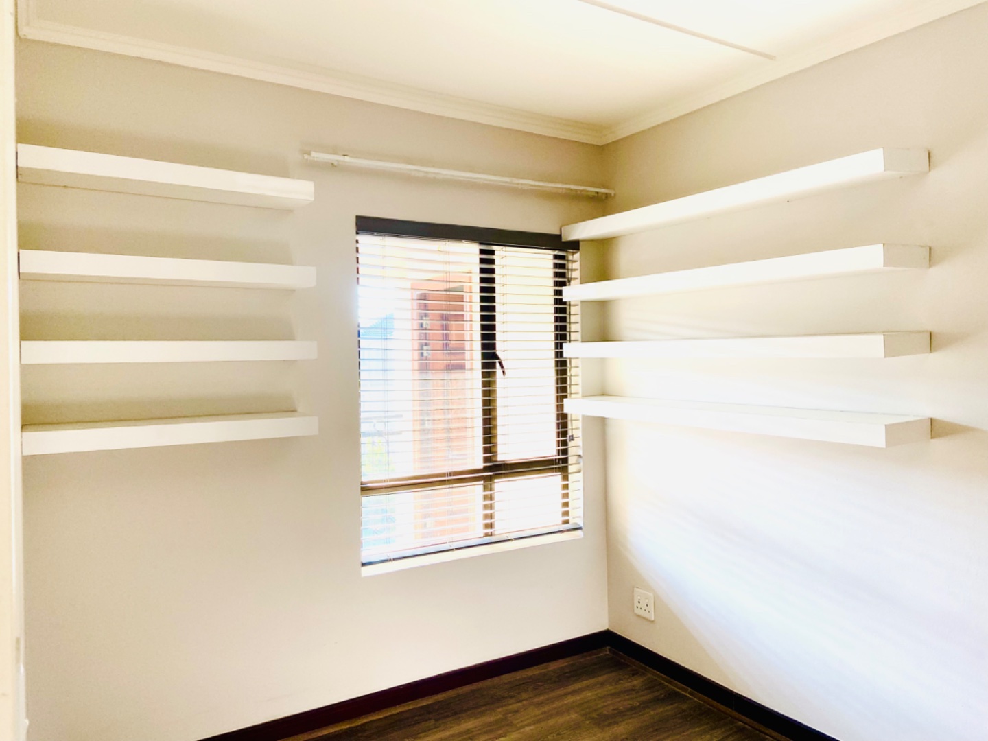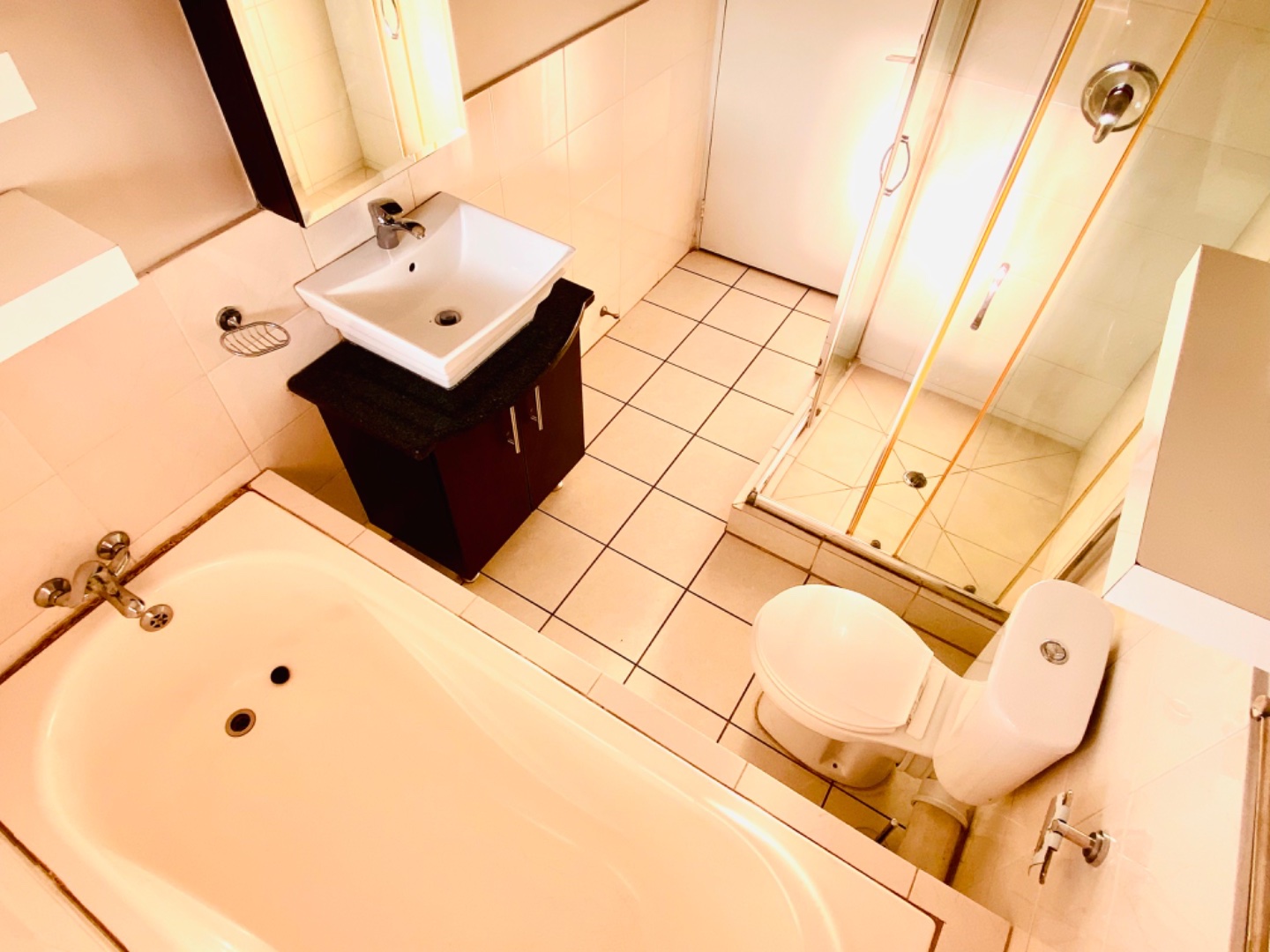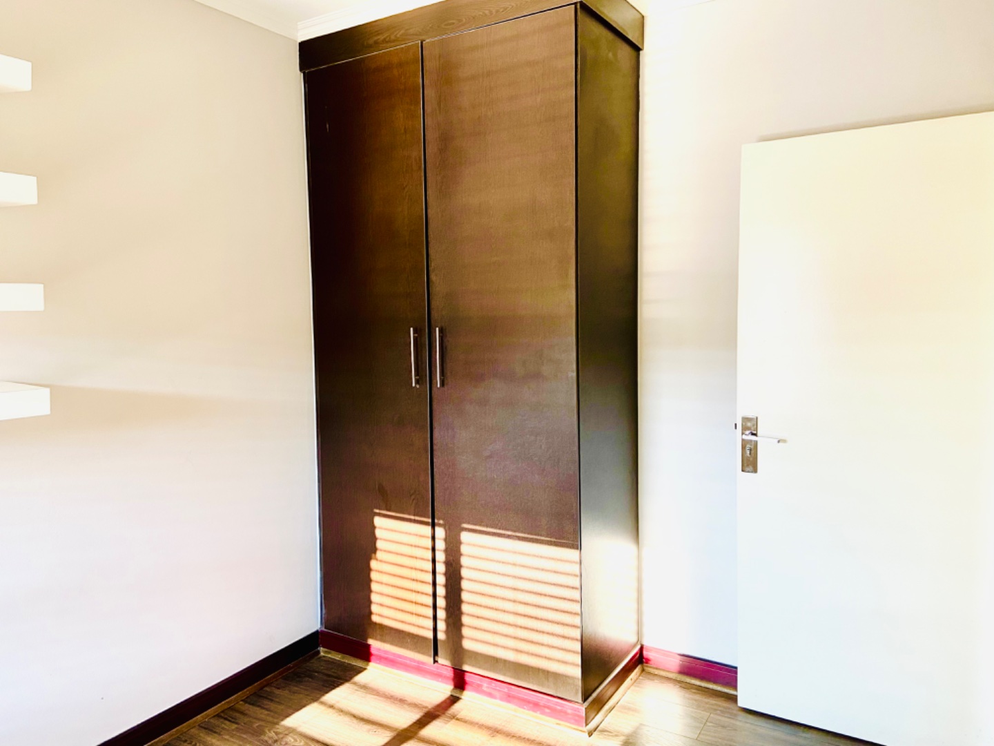 This lovely property offers two bedrooms which are fitted with laminated flooring and modern built-in cupboards. The bedrooms have extra selves and the main bedroom is fitted with a head board. A full bathroom which consists of a bathtub, shower, toilet and a basin.