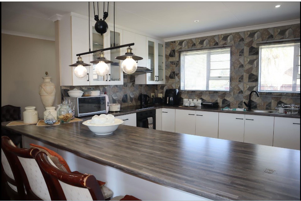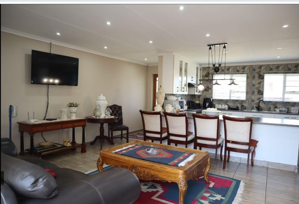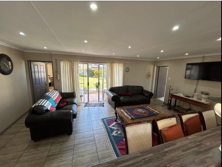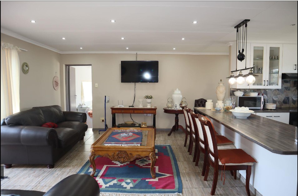 The heart of this home is its central open-plan living area, seamlessly combining the lounge and kitchen into an inviting, interconnected space. From the lounge, step out onto a patio with a built-in braai (barbecue), overlooking a beautifully maintained garden and ideal for relaxation and outdoor entertaining.