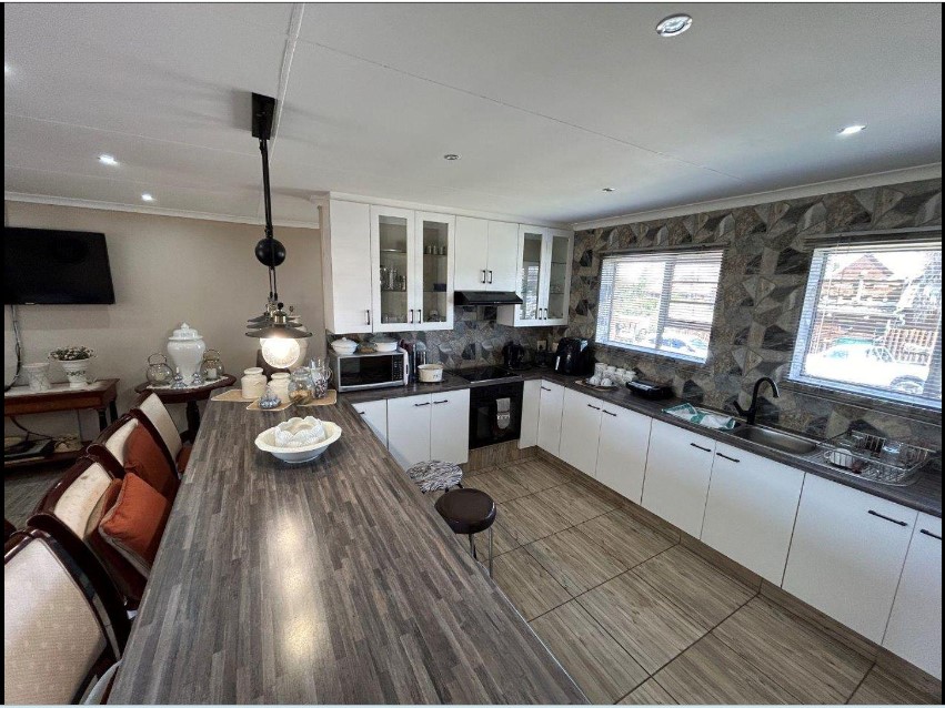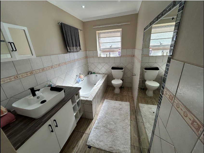 Welcome to this delightful 190 m2 family home, set on a spacious 640 m2 plot. The home features modern tiled flooring throughout and is fitted with sleek aluminium windows and sliding doors. The property is fully enclosed, offering privacy, and includes a paved driveway for added convenience.