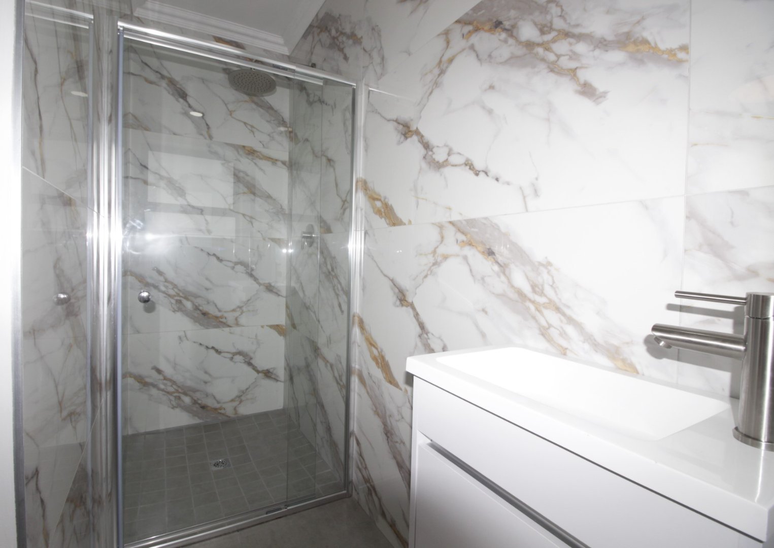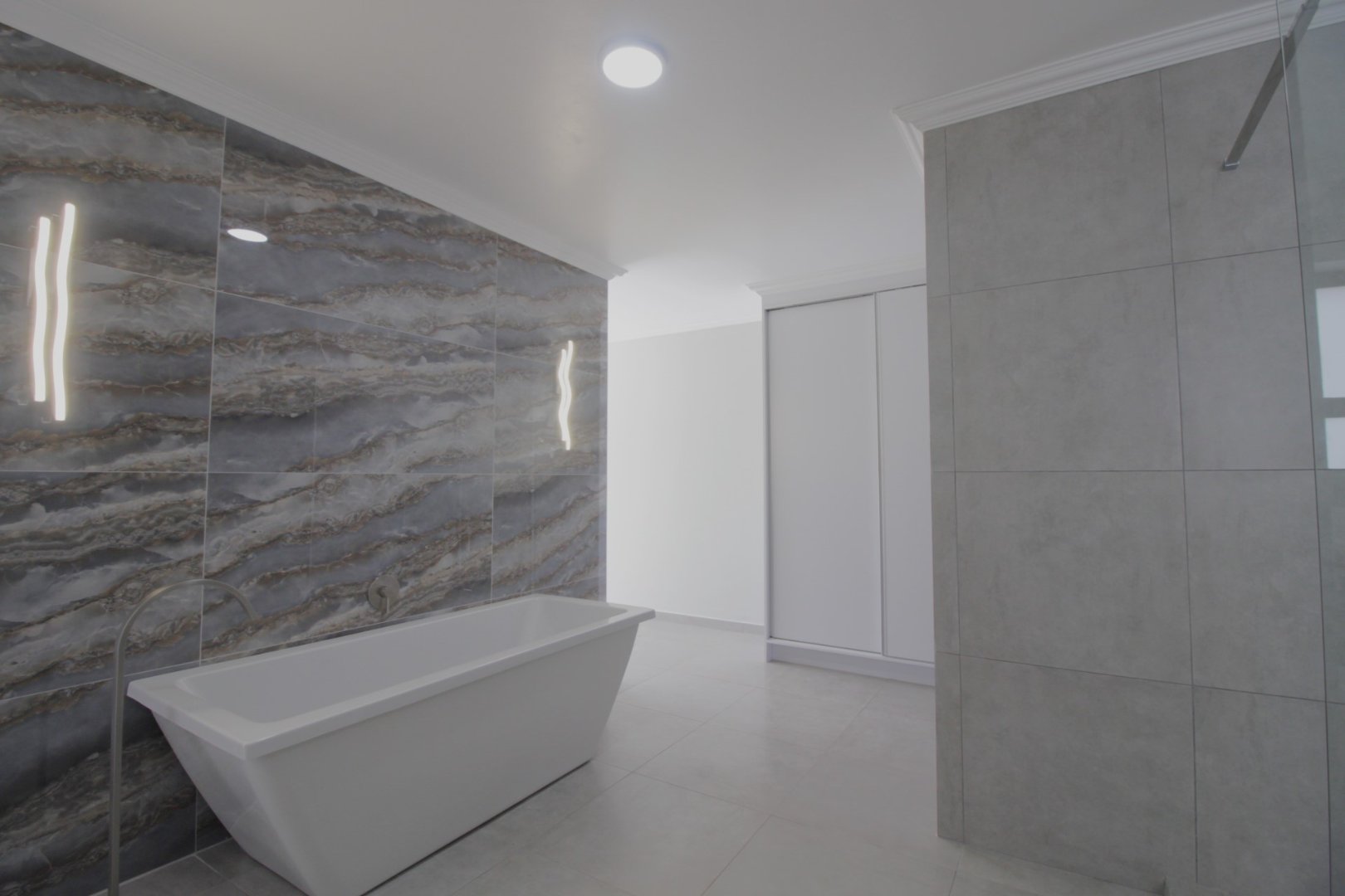 The main en-suite is a luxurious state-of-the-art retreat with ample space, walk-in shower, a double basin, a bath, huge mirrors, and exquisite detailing