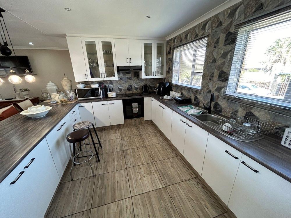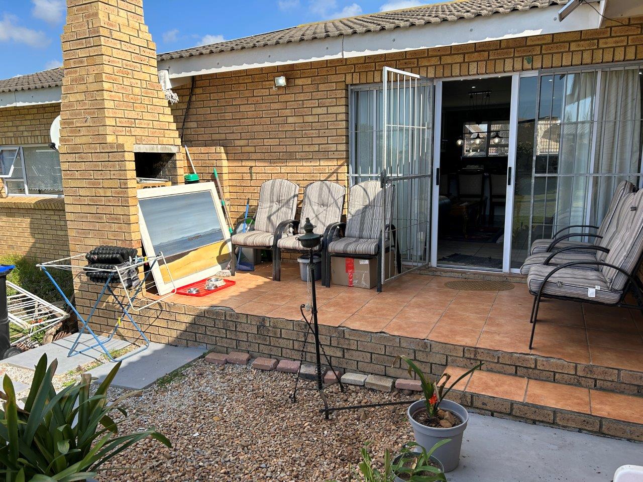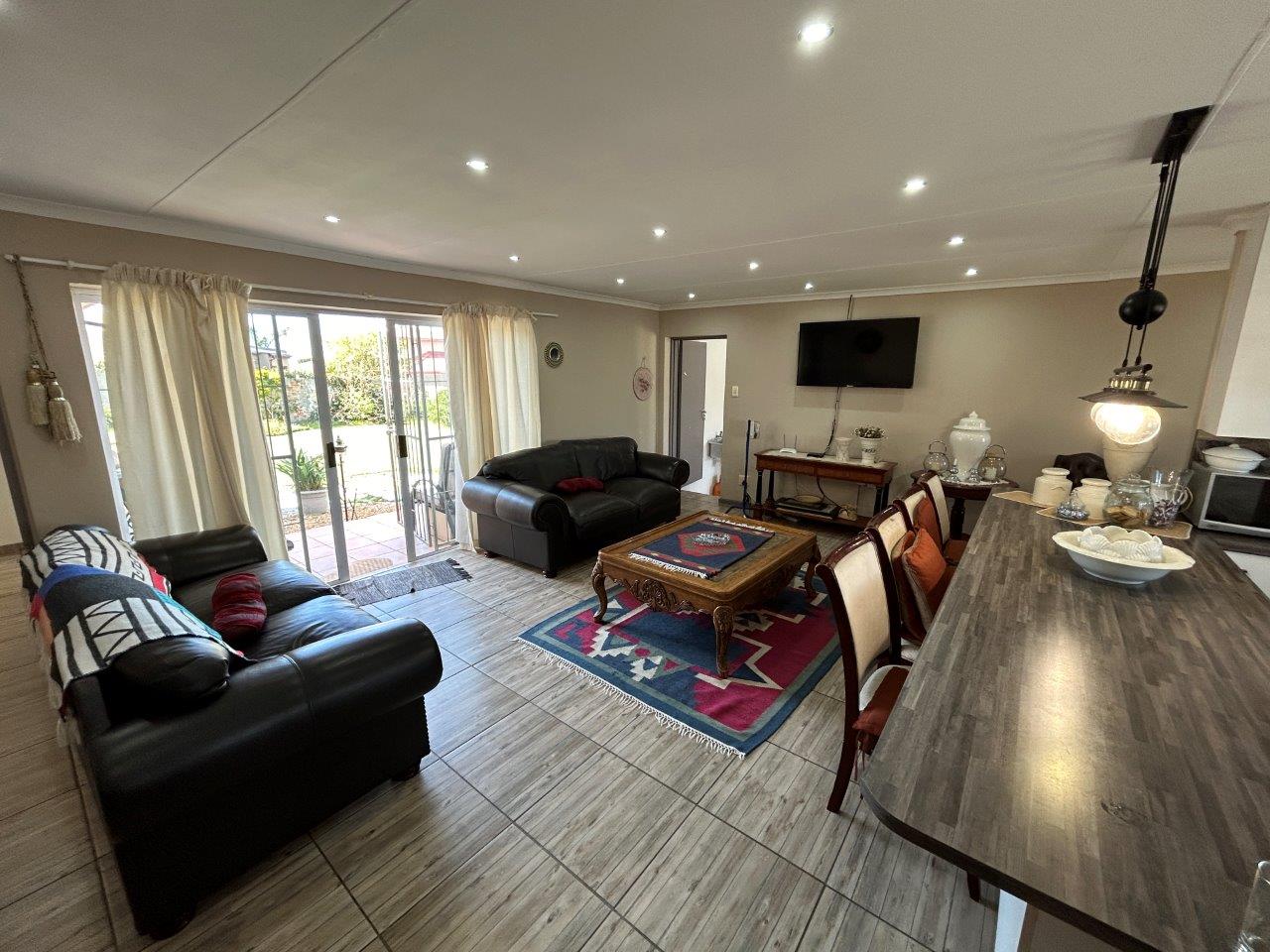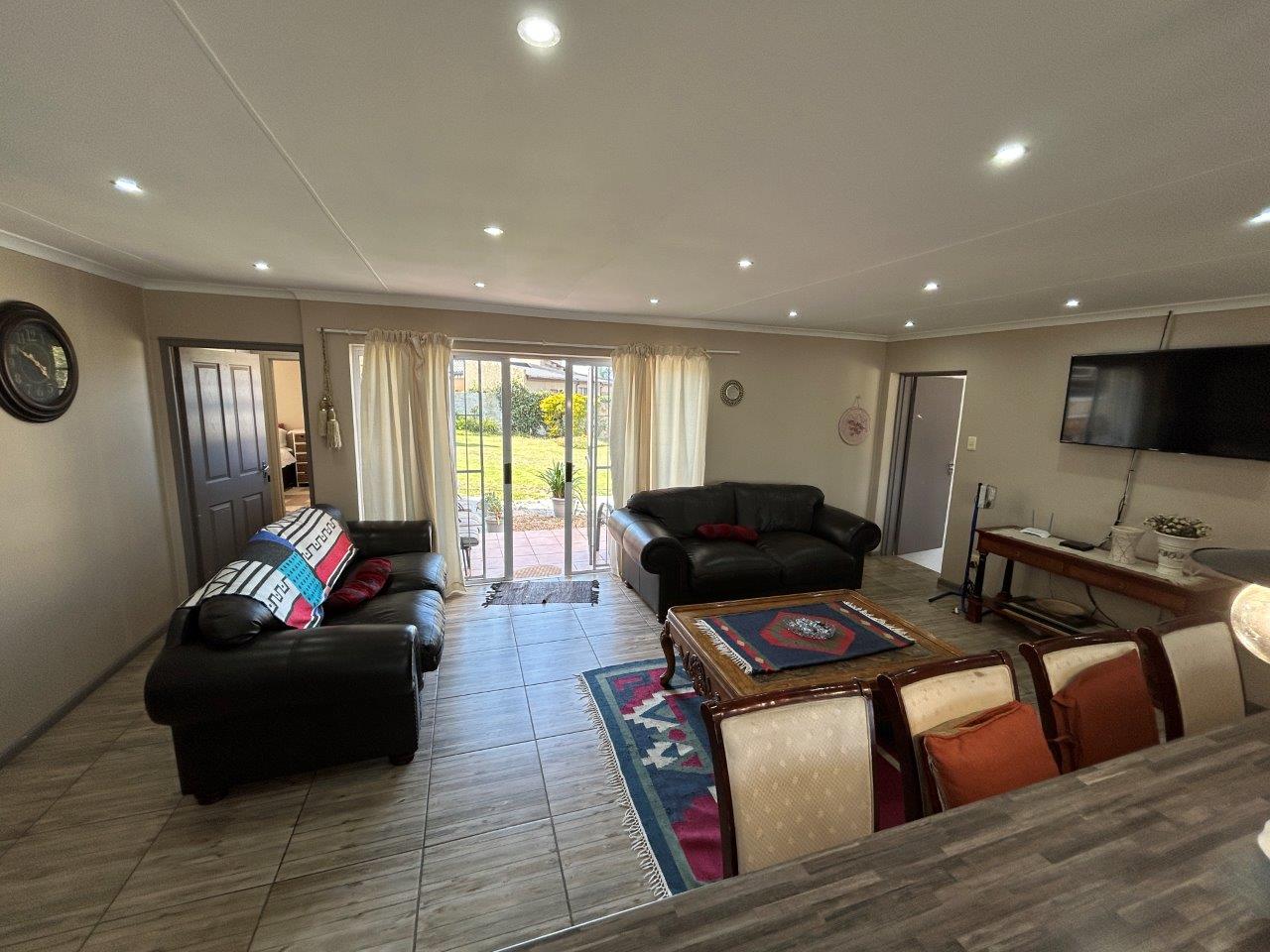 The central open-plan living area combines the lounge, and kitchen, creating a lovely interconnected space. From the lounge, you can access a patio with a built-in braai and a large, well-kept garden, perfect for relaxing and entertaining.