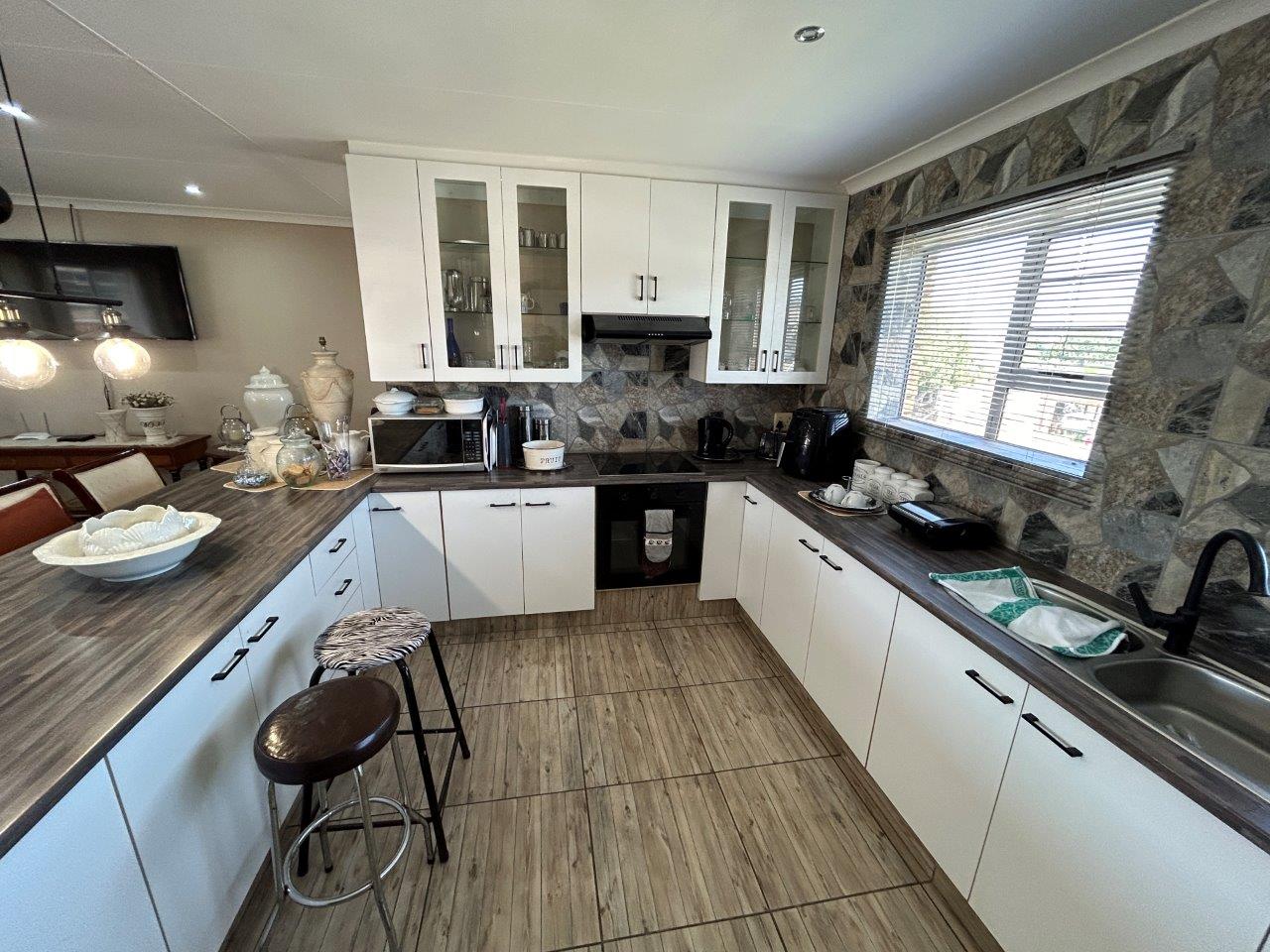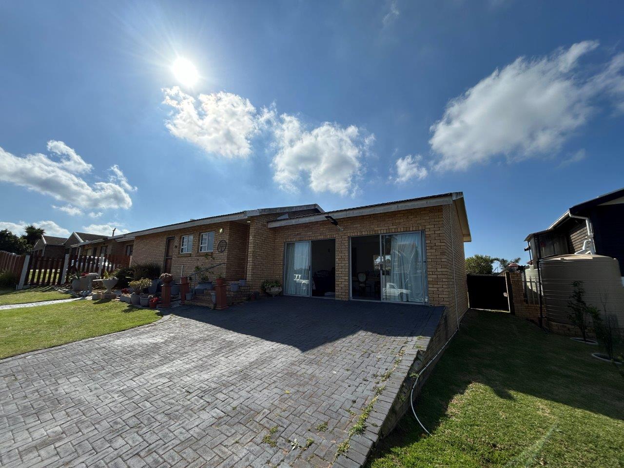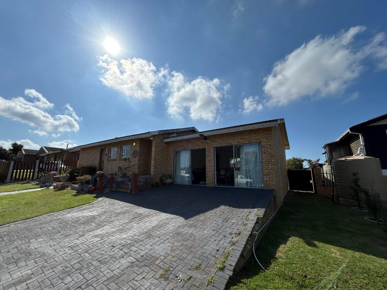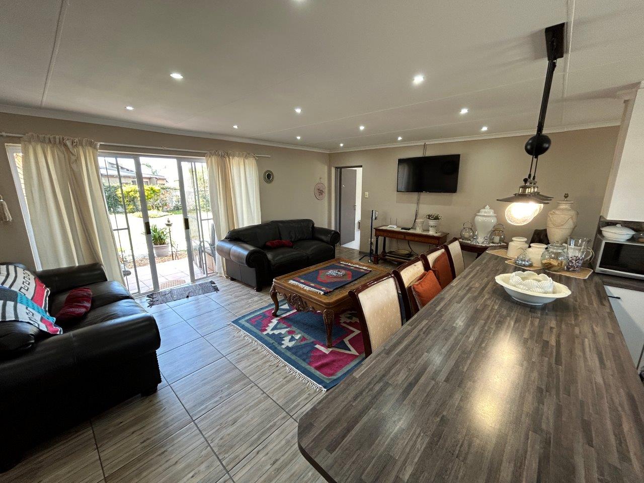 The central open-plan living area combines the lounge, and kitchen, creating a lovely interconnected space. From the lounge, you can access a patio with a built-in braai and a large, well-kept garden, perfect for relaxing and entertaining.