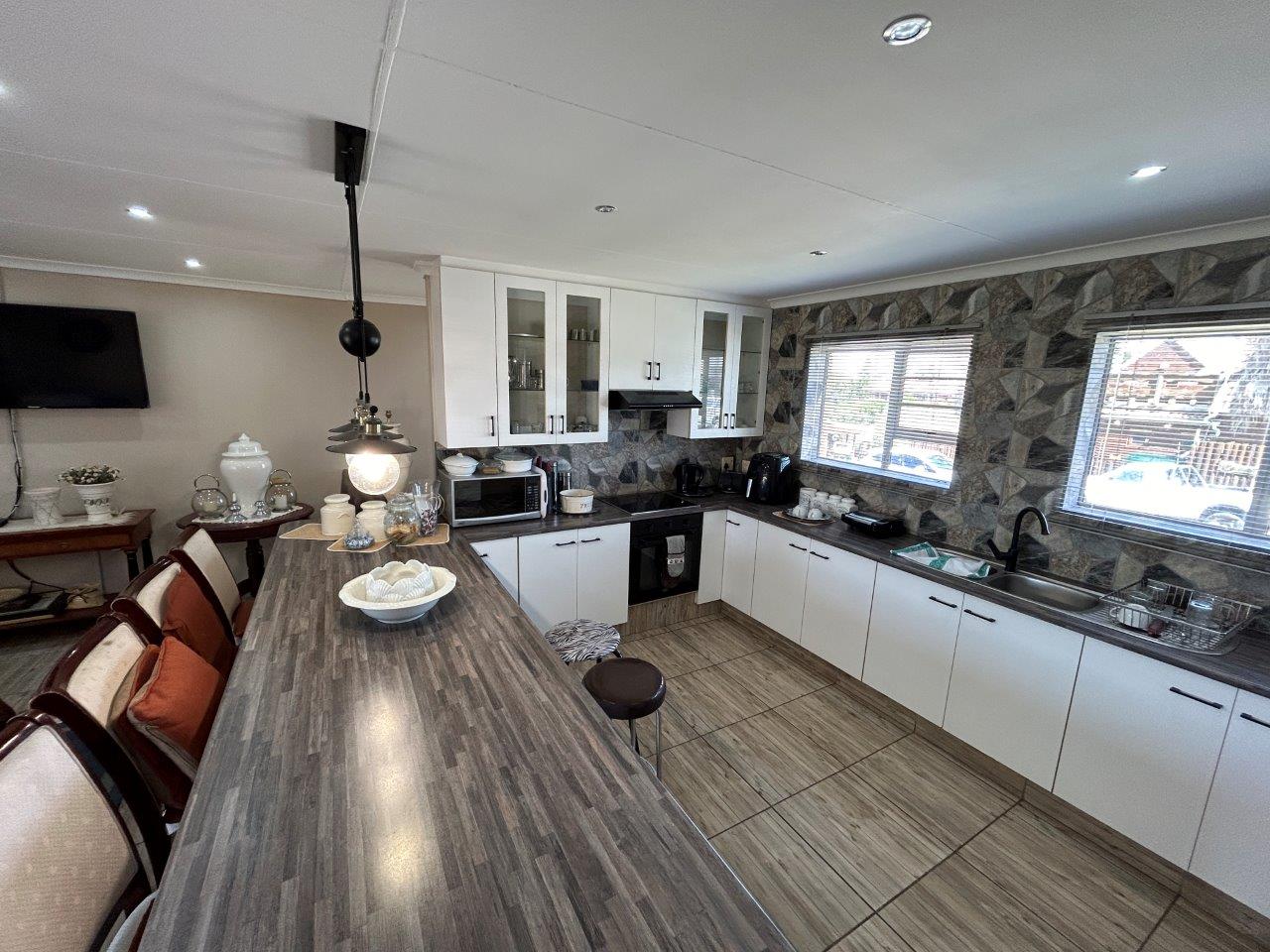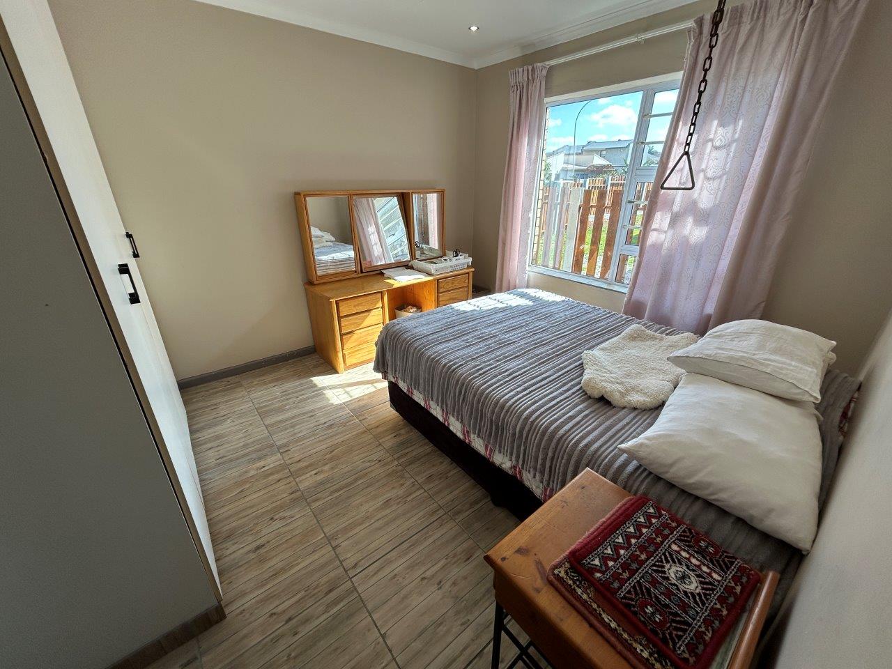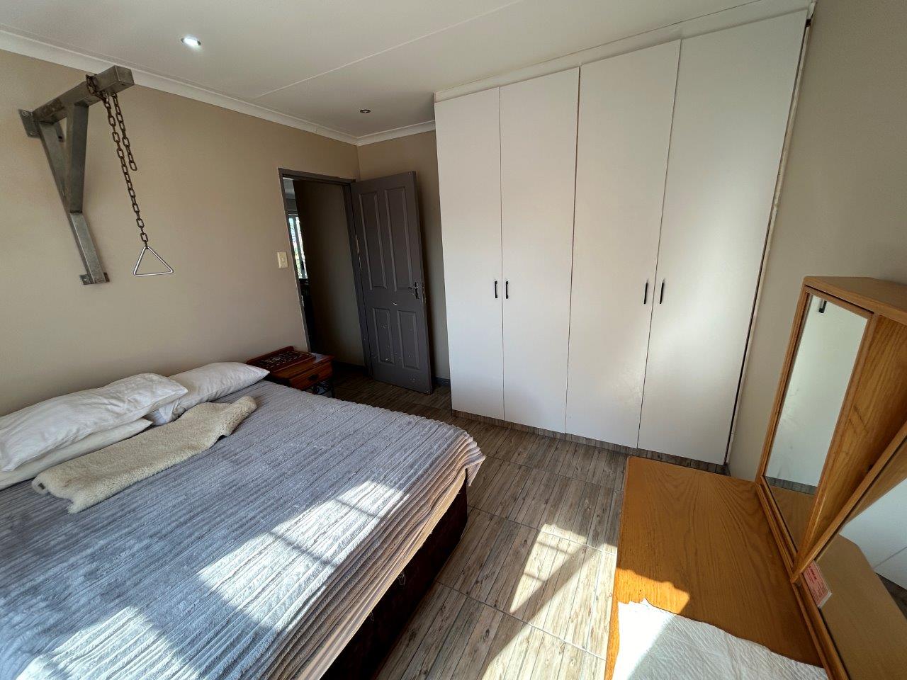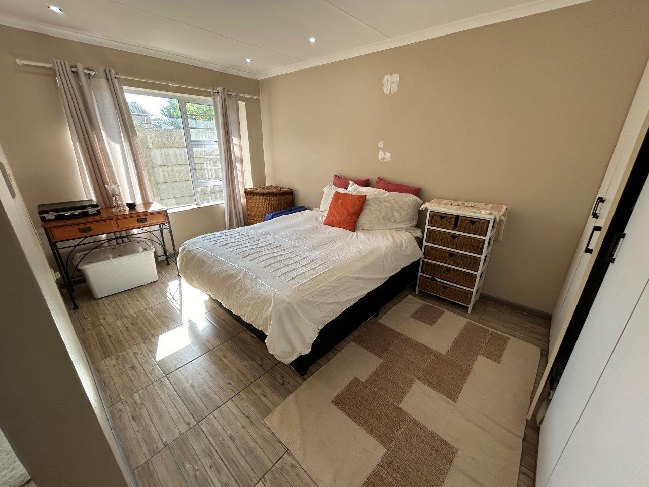 The central open-plan living area combines the lounge, and kitchen, creating a lovely interconnected space. From the lounge, you can access a patio with a built-in braai and a large, well-kept garden, perfect for relaxing and entertaining.