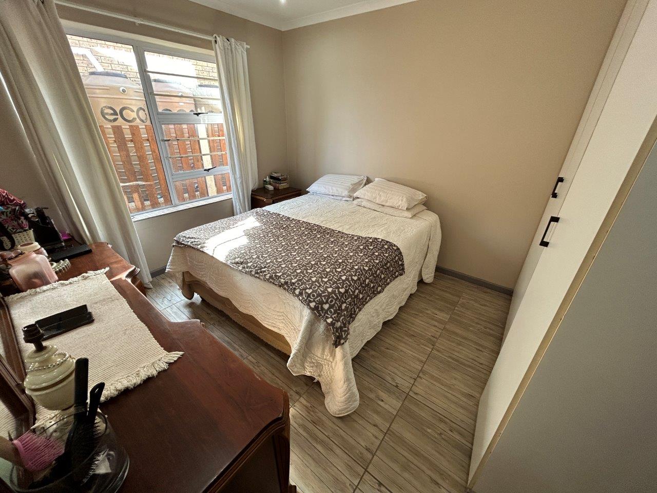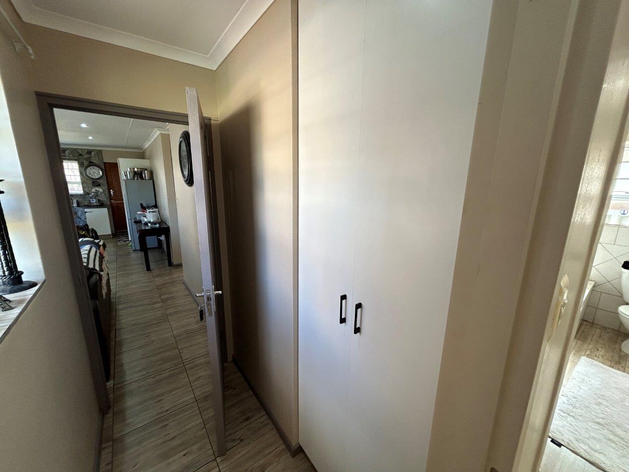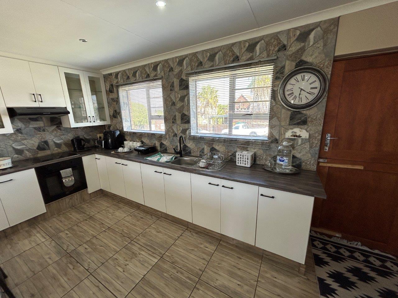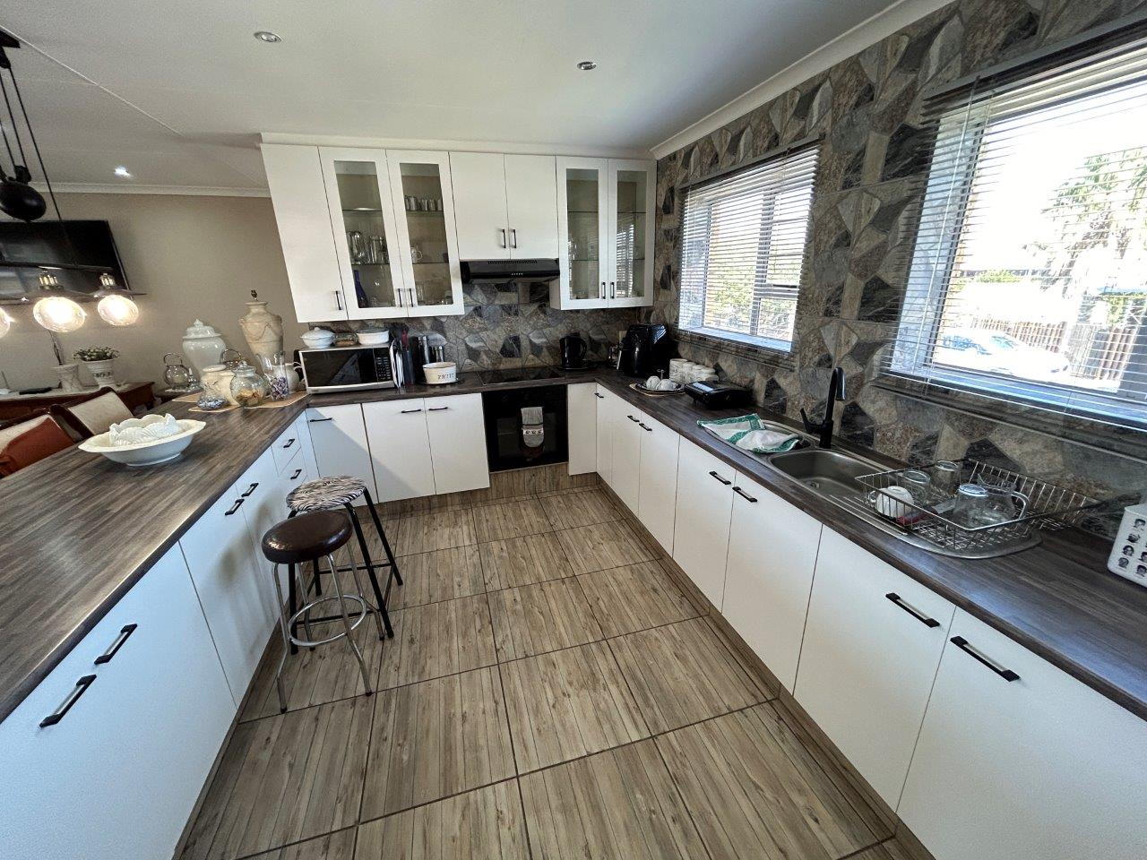 Step inside to discover a modern, open-plan kitchen equipped with a electric stove, electric oven, and extractor fan. There's also ample space for a large fridge. The home offers three bedrooms, each with own built-in cupboards, and two bathrooms, including one main en-suite.