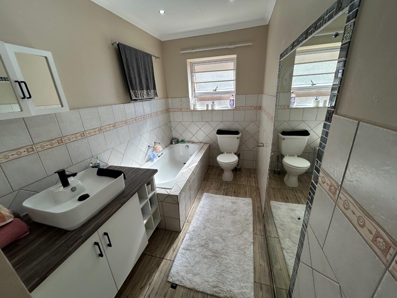 Welcome to this charming 190 m2 family home, situated on a generous 640 m2 plot. This home features tiled flooring throughout and aluminum windows and sliding doors. The property is fully walled and includes a paved driveway .