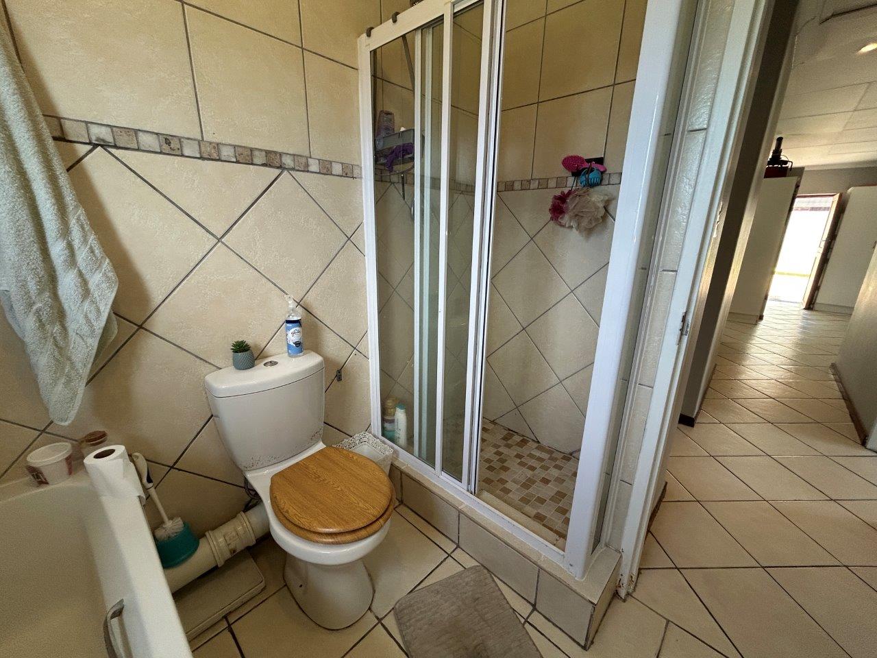 Down the passage are three bedrooms and two bathrooms, including a main bedroom with its own en-suite bathroom. All bedrooms are fitted with built-in cupboards. The home is fully tiled, and the property is completely walled for added privacy and security.