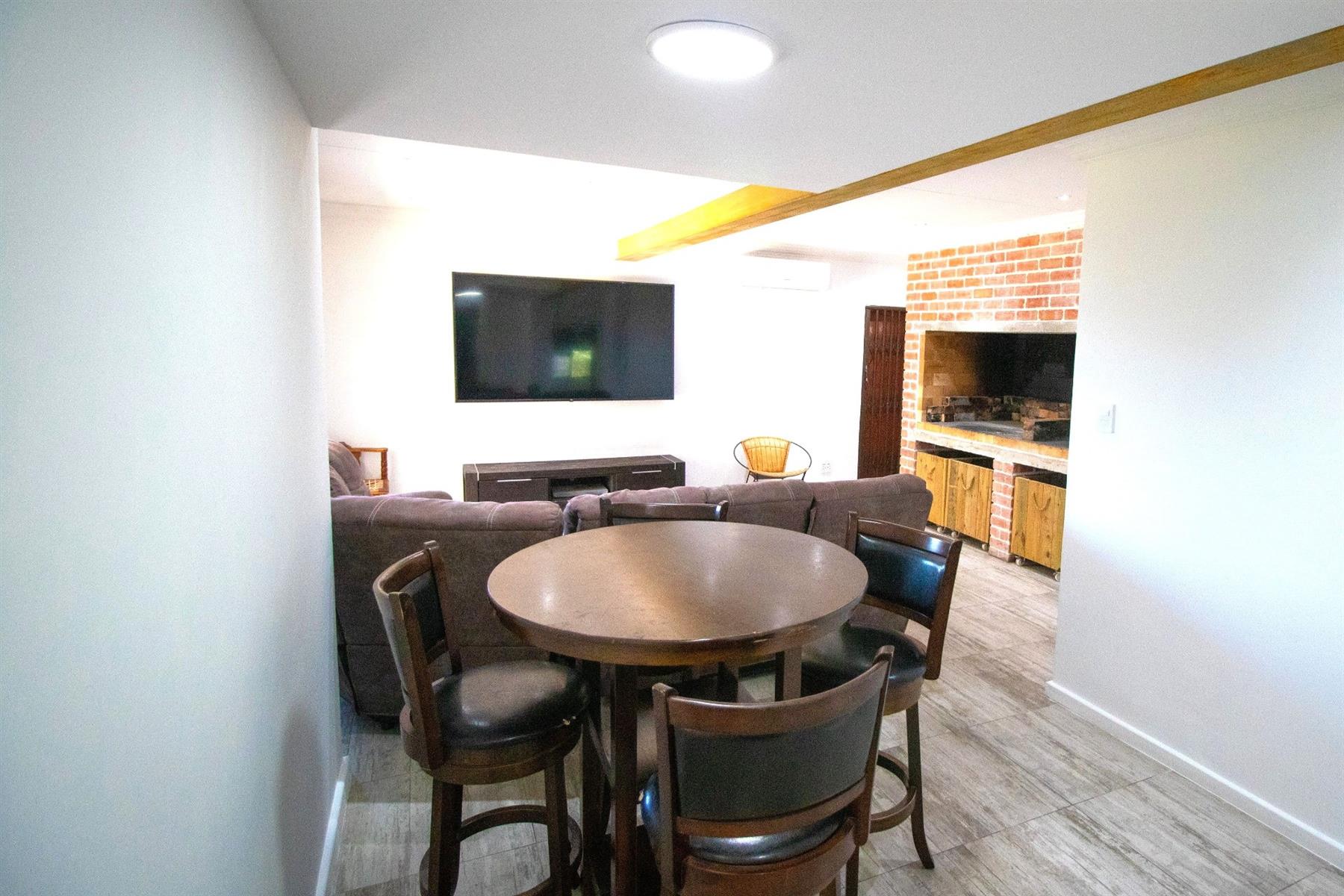 The open-plan layout combines a modern kitchen, dining area, and lounge, seamlessly flowing into the braai and entertainment room — complete with a built-in braai that works perfectly, ideal for year-round gatherings.