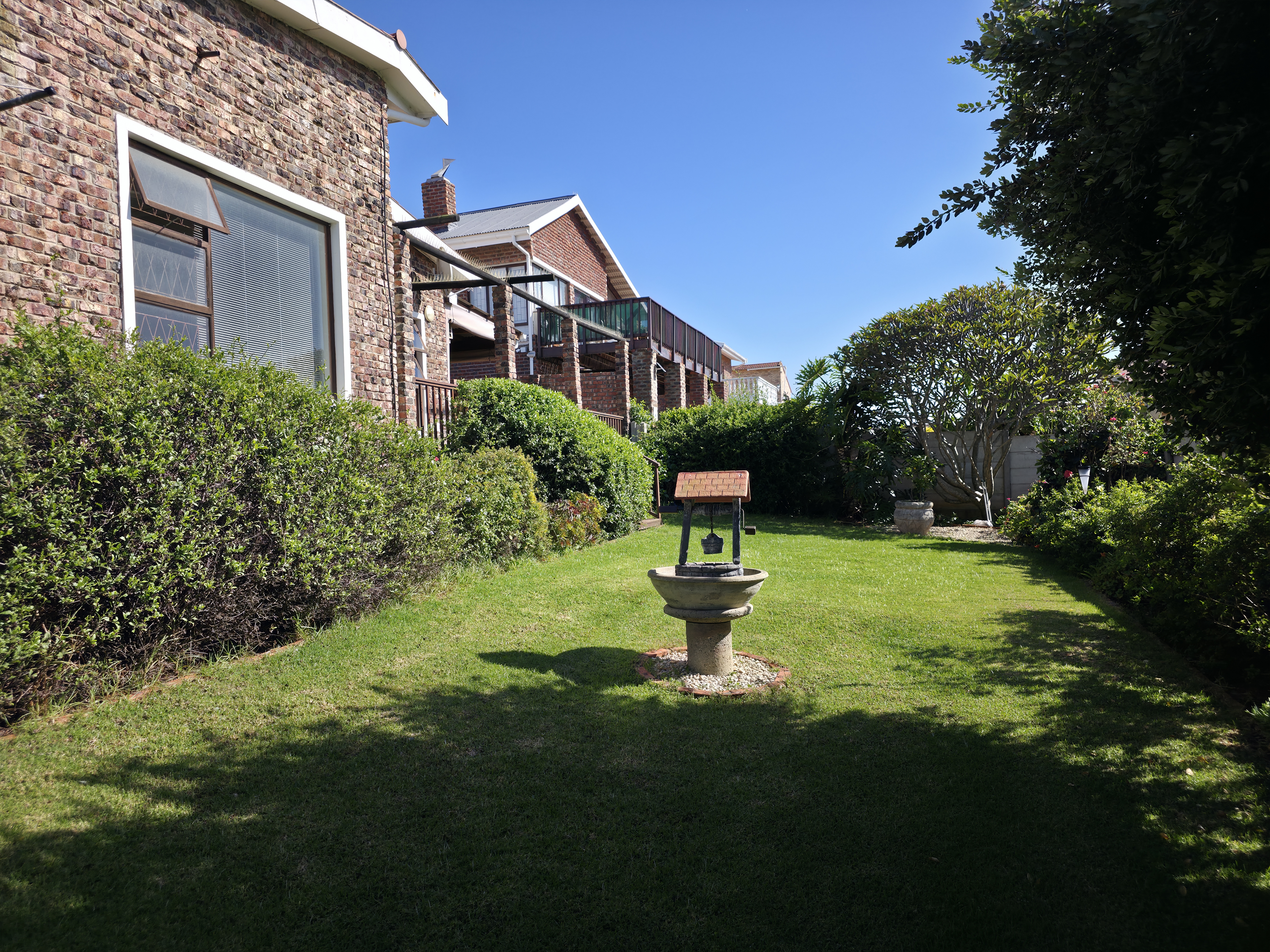 The more informal TV lounge connects seamlessly to the open-plan kitchen, where family and friends can gather. From here, sliding doors open to a lovely sheltered patio with a built-in braai — the perfect spot for laughter, conversation, and outdoor entertaining. Enjoy beautiful garden views and a gentle sea glimpse from this peaceful area.