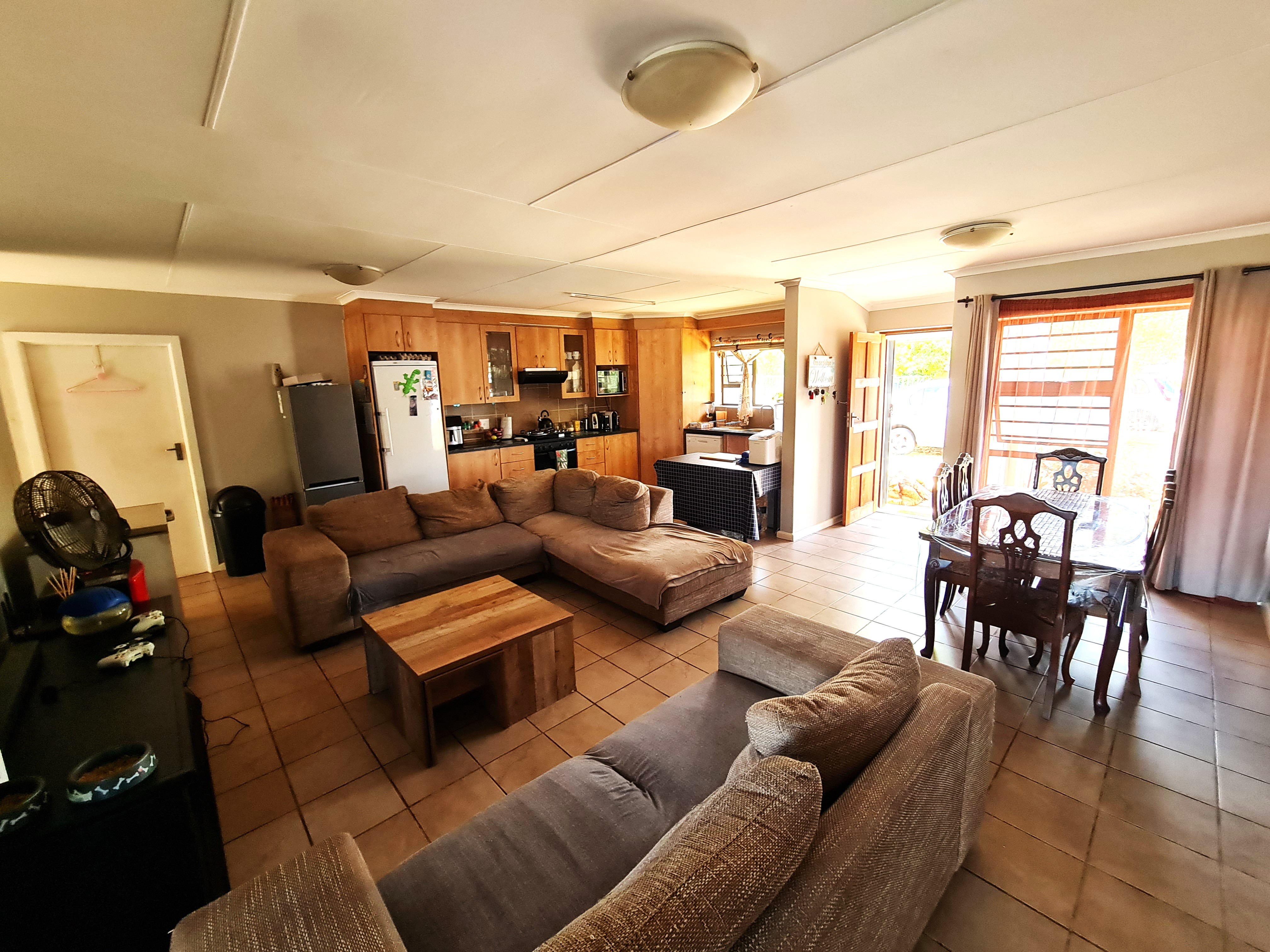 Open-plan lounge, dining and kitchen areas. Tiles and laminate flooring throughout.