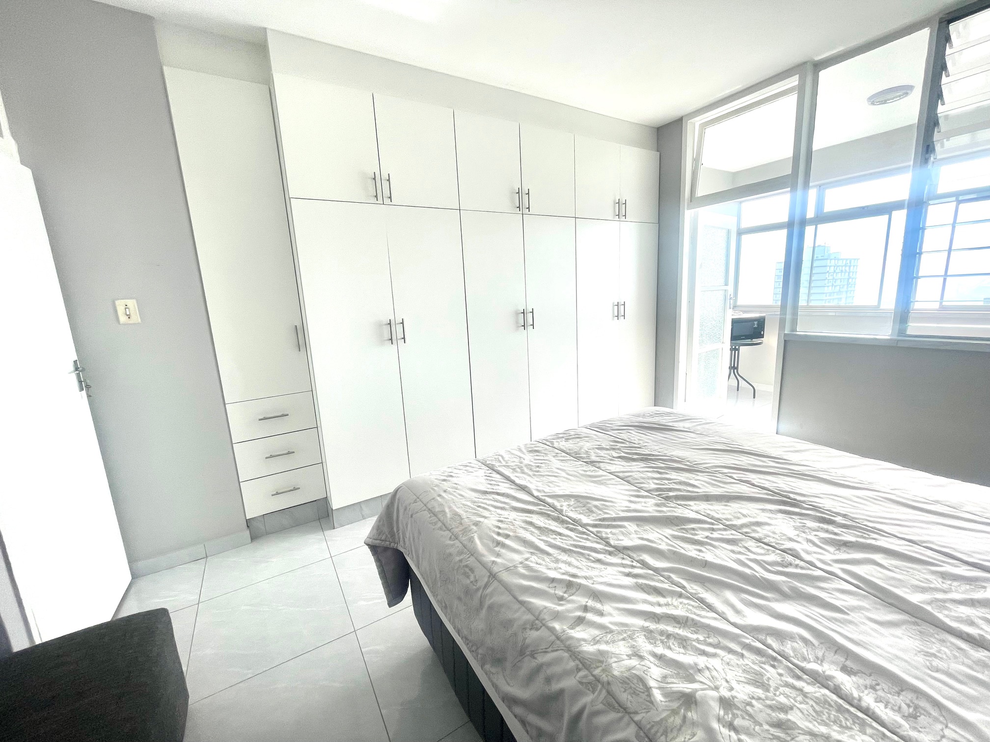 Neatly tiled floors throughout the apartment. Spacious living area as you step in, facing big windows which brighten the whole unit. From living area is a half bedroom also with sea views facing north. It can be used as a home office if you work from home. A perfectly fitted kitchen with hob and oven fully complements this apartment. The bathroom consists of a huge shower and space to install plumbing for a washing machine.