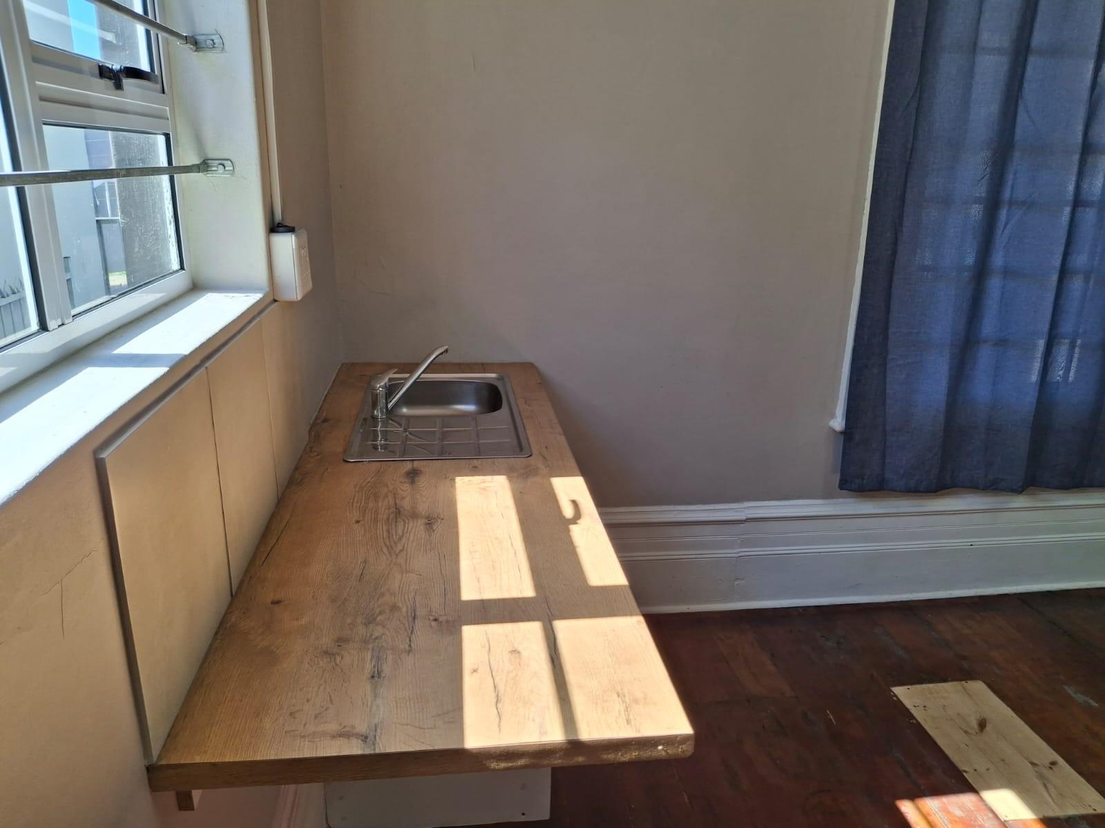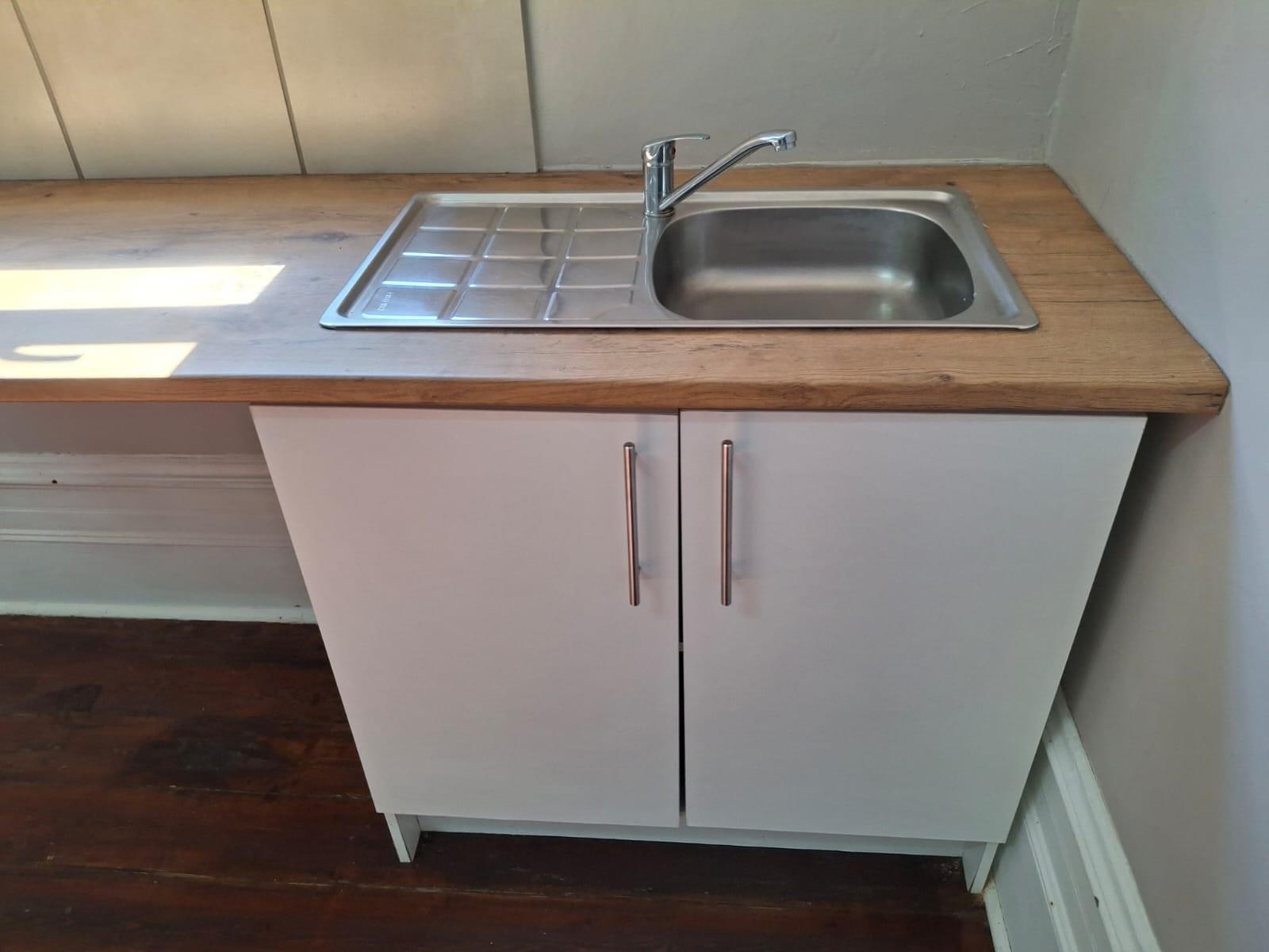 The kitchenette is equipped with a sink and prep area, offering a practical space for your culinary needs. Built-in cupboards provide ample storage, adding to the apartment`s efficiency.
