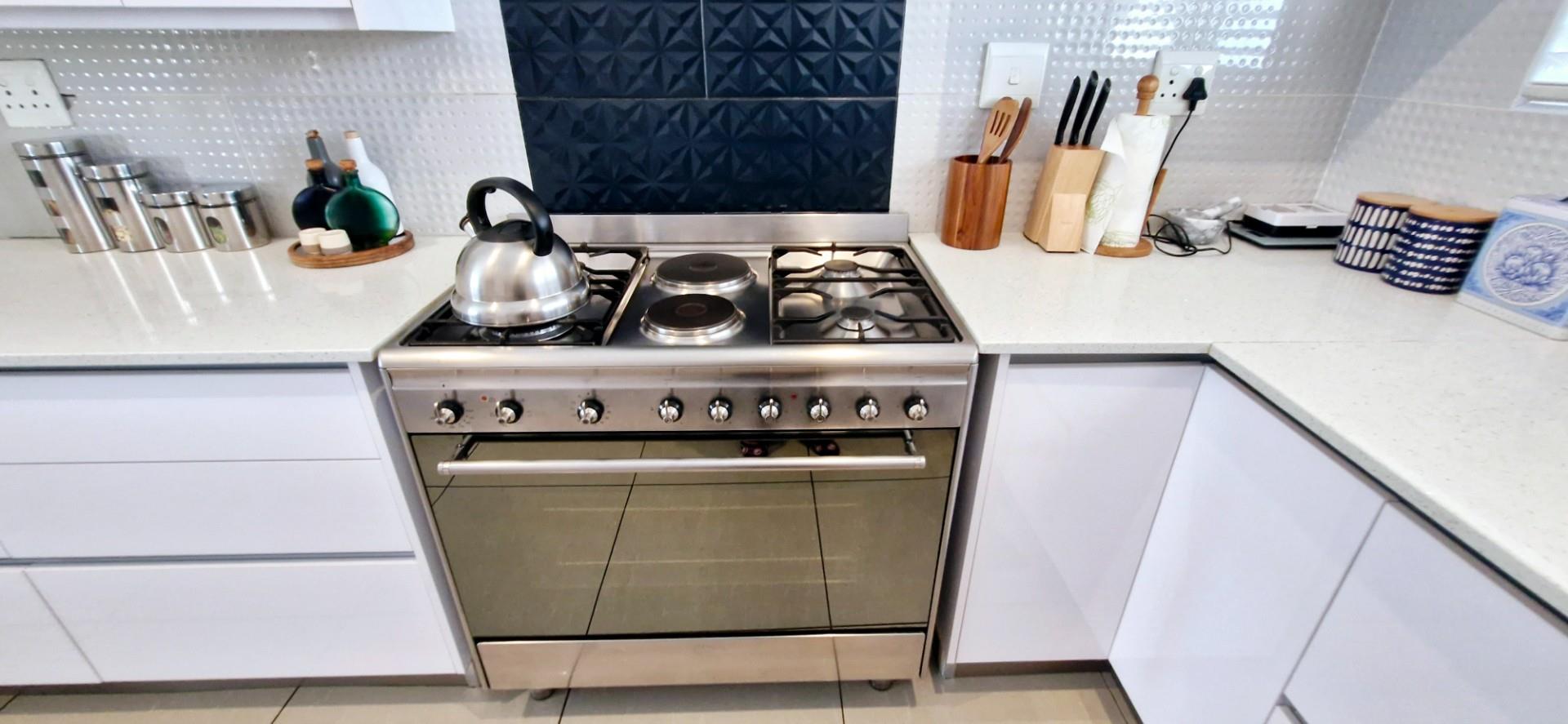 The ground floor offers expansive open-plan living areas, effortlessly connecting the lounge and dining spaces and flowing out to a covered patio overlooking a sparkling swimming pool an ideal setting for entertaining. The lounge is enhanced by a stylish gas fireplace, while the designer kitchen features carefully selected fittings, including a Smeg gas stove, Caesarstone countertops, chic blinds, and a well-appointed scullery with space for two wet appliances and ample storage. The scullery provides direct access to the automated double garage, which is fitted with an inverter and a prepaid electricity meter.