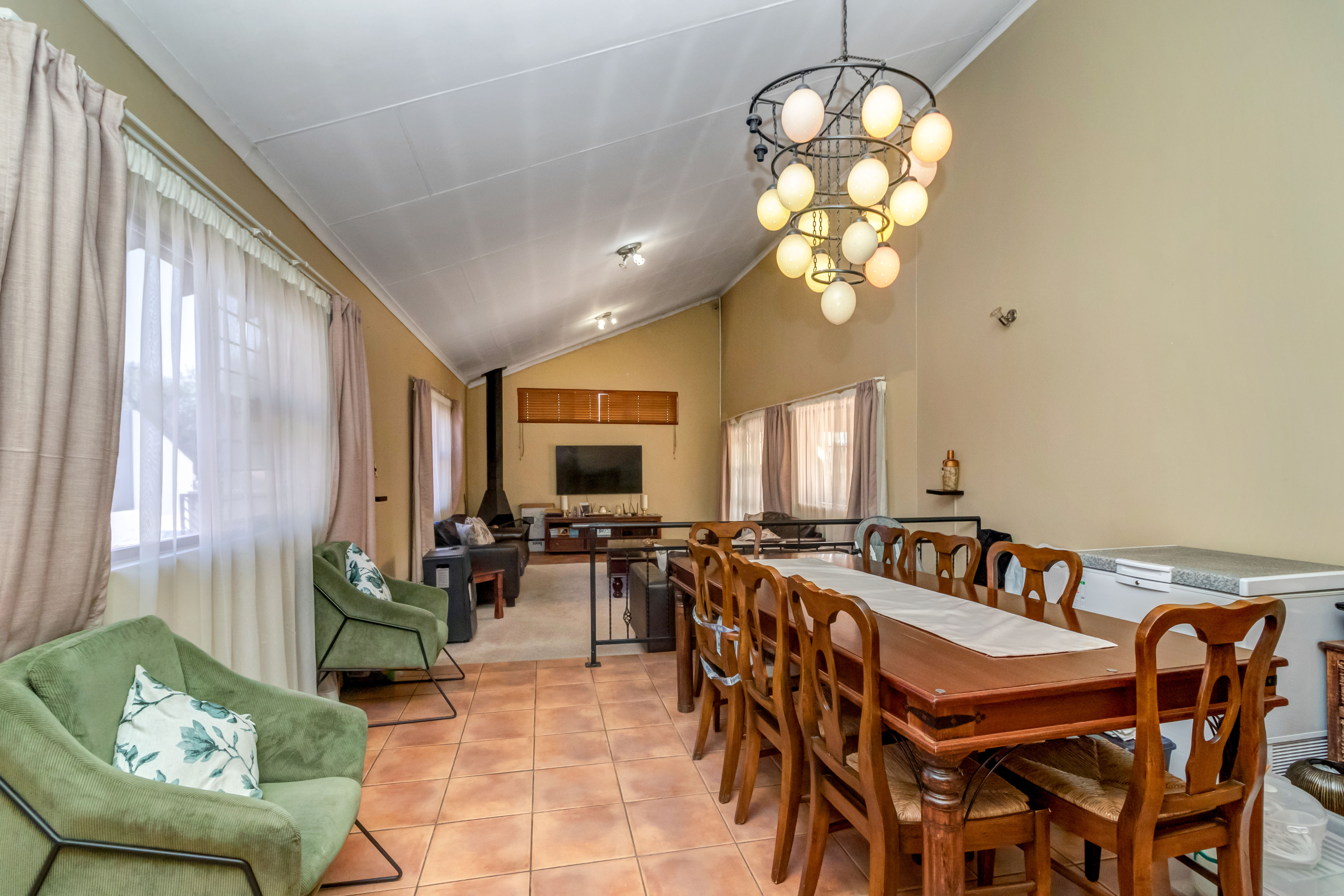 An open living area that encompasses both a dining room and a cozy living room, seamlessly extending to a private patio.