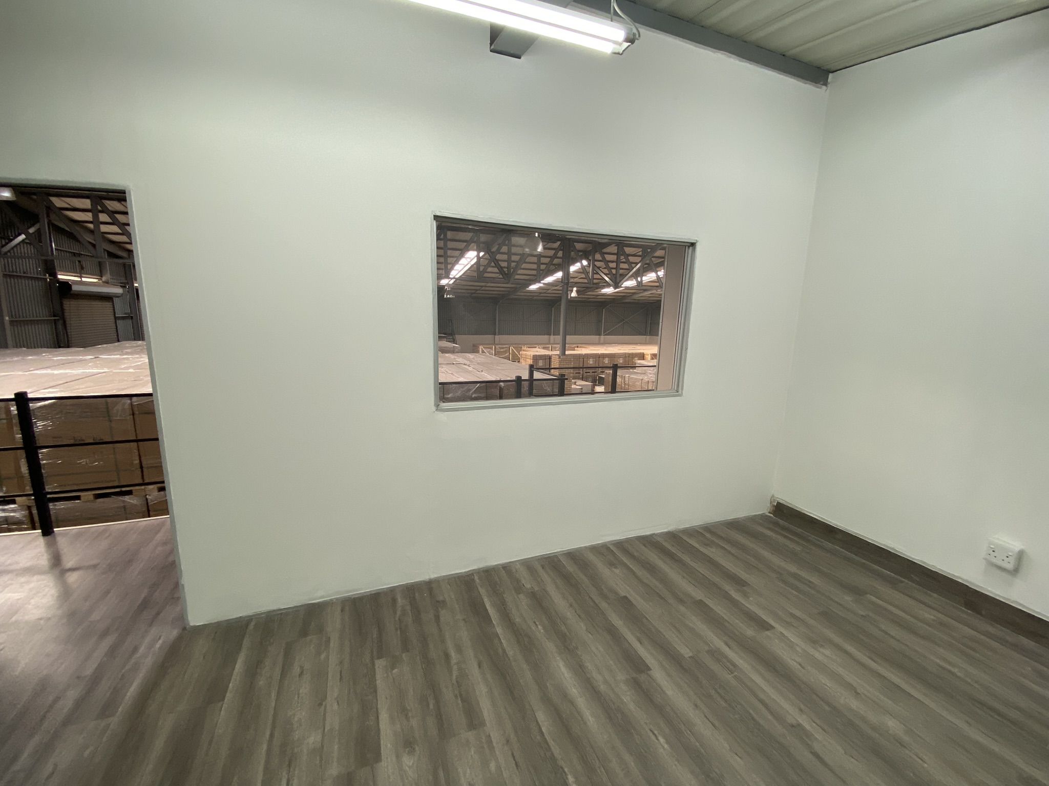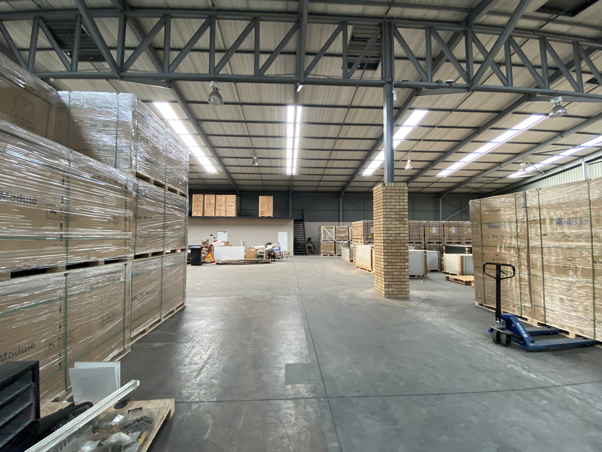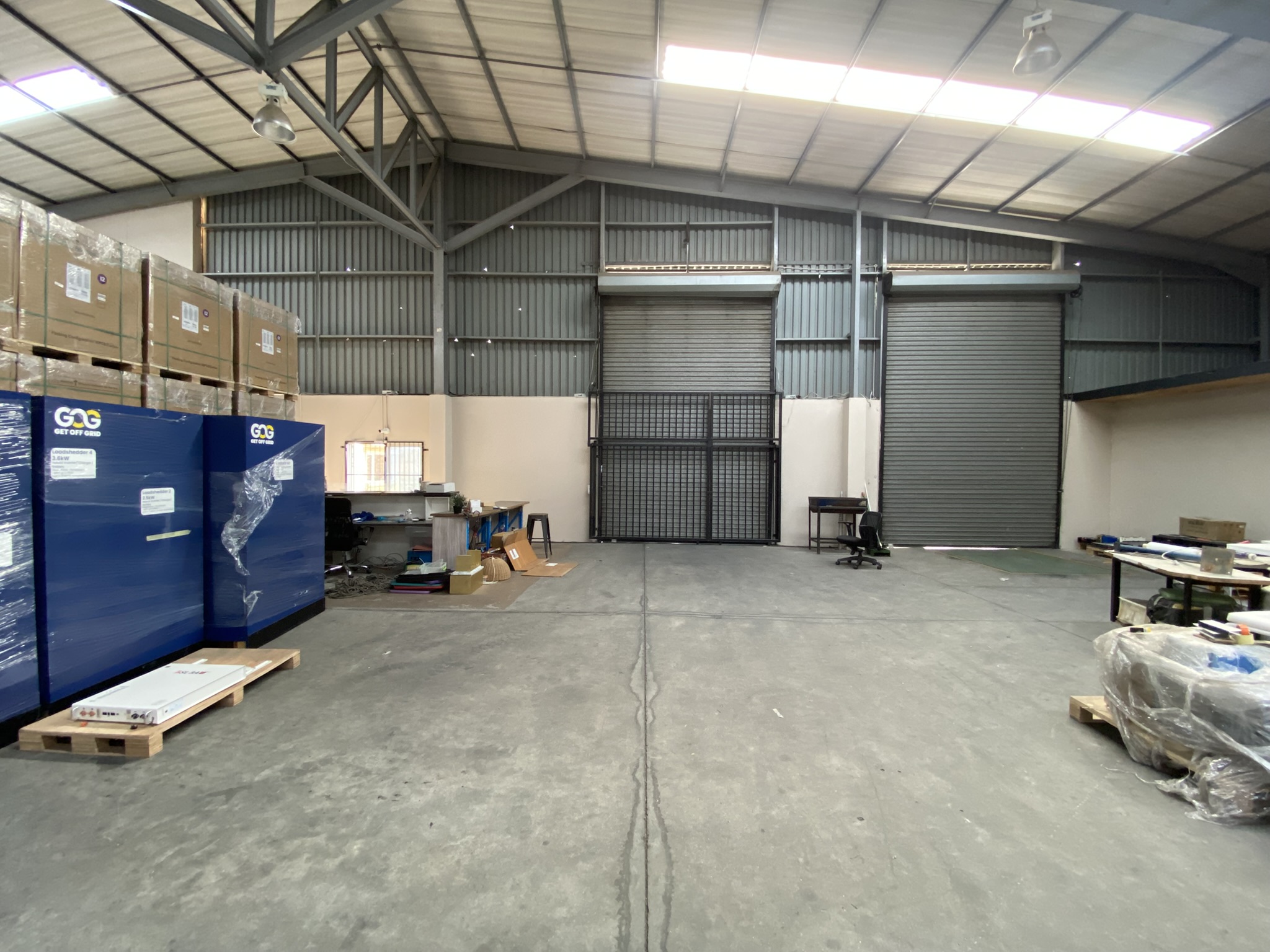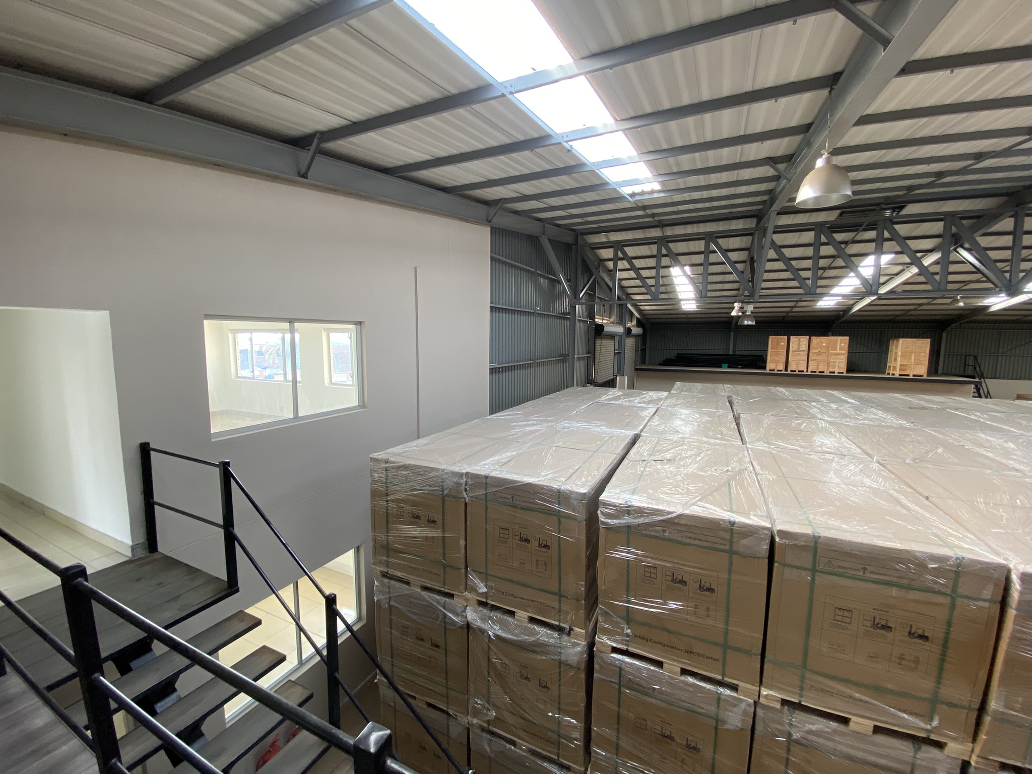 Positioned within a secure business park with 24-hour access control, and set on a 2388m2 stand, the property comprises a 1,235m2 warehouse with a 420m2 office component. The warehouse includes two roller-shutter doors (one on-grade and one dock-level), 6m height to eaves, and a 150m2 mezzanine.