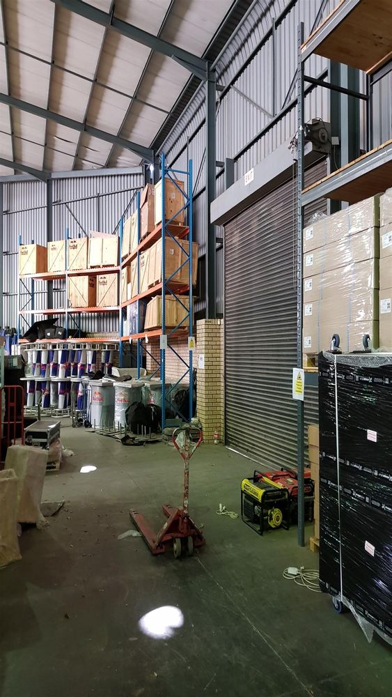 The warehouse has an eave height of 7.7m to the eaves. It includes three large roller shutter doors. Three additional smaller roller doors provide access to a ground floor open plan area beneath the offices, which can be used for light warehousing or storage.