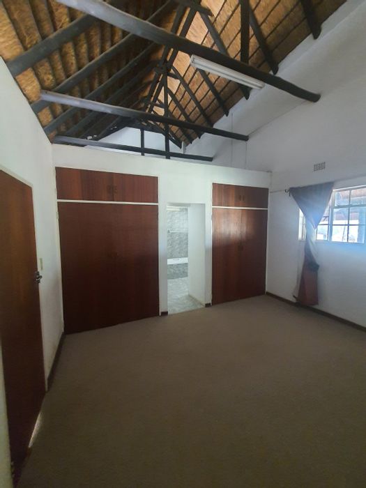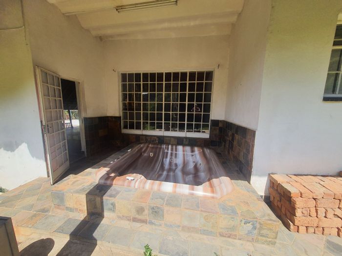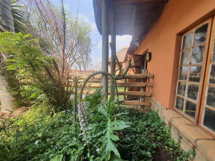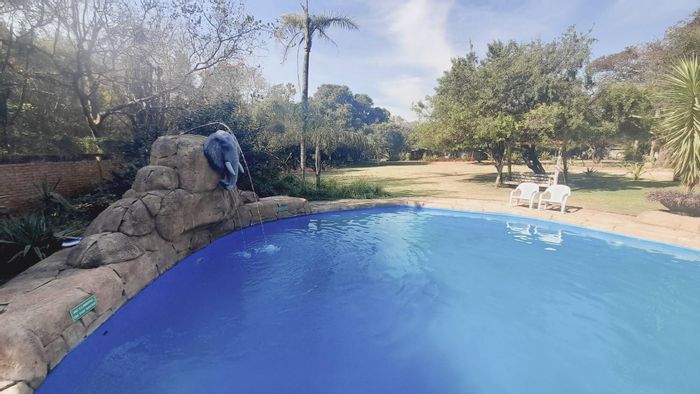 Escape to eco-luxury bushveld living near Brits and Lanseria, with a pool featuring rock waterfall and jacuzzi, boma braai area, and four double-volume bedrooms.