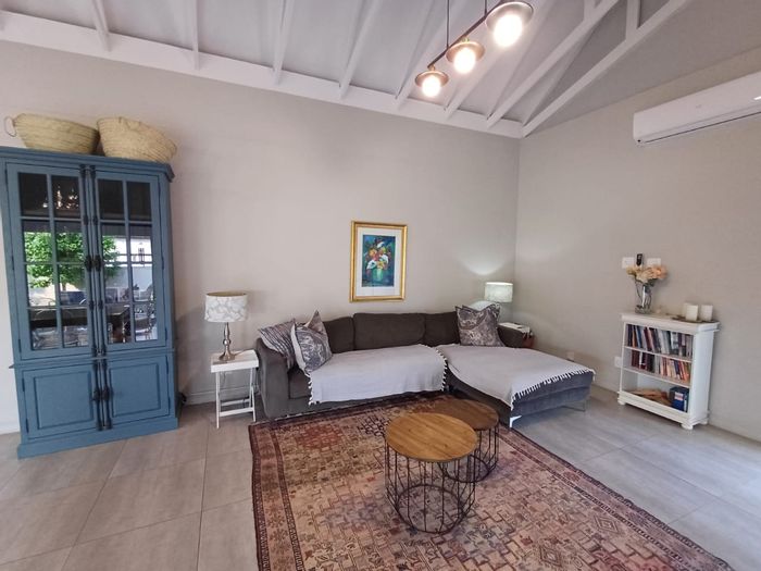 Lakeside living at Leloko Estate, Hartbeespoort — nature trails, waterfront picnic and braai spots; single-level townhouse with exposed trusses, open-plan kitchen, patio and double garage.