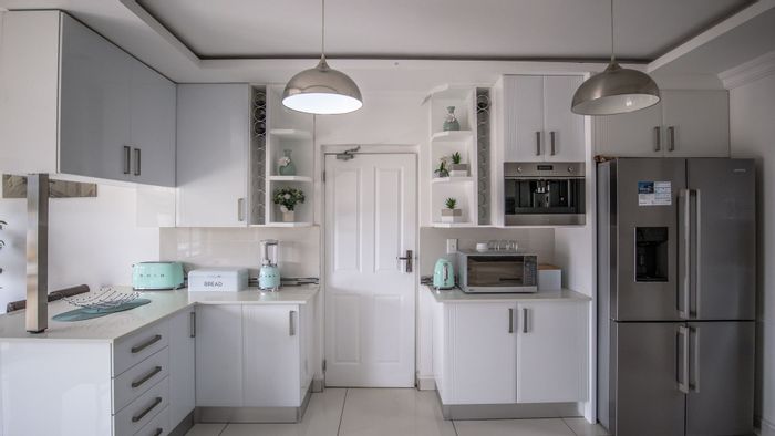 North-facing townhouse in The Coves Estate, enjoy a covered patio with wooden sliding doors for evening braais, upstairs balcony, private garden, fireplace and double garage — 3 beds, 2.5 baths.