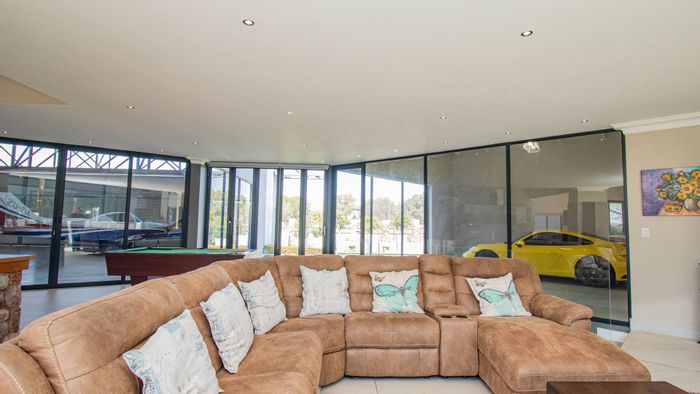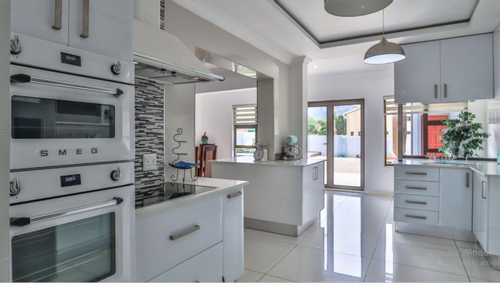 Entertainer's retreat in The Coves, overlooking pivot fields and the Magalies Mountains, with double-volume living, boma, built-in gas braai and pool — four bedrooms, 2.5 baths, double garage.