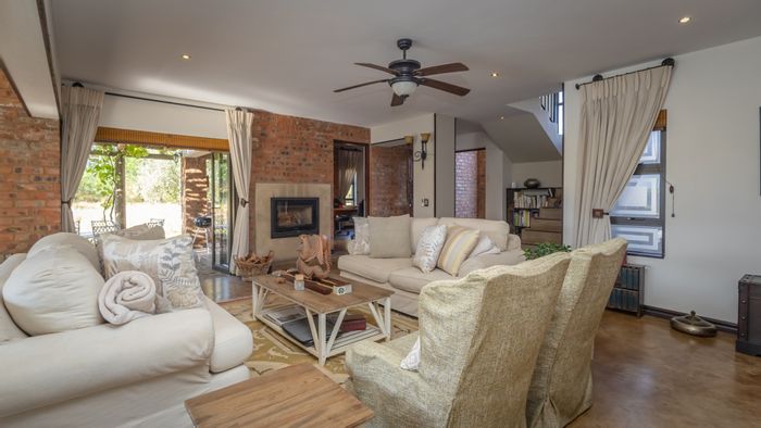 Tranquil Magalies Mountain retreat in The Coves estate, with double-volume living, wooden fireplace, mezzanine office, covered patio with pizza oven and boma — 4 beds, 3 baths.