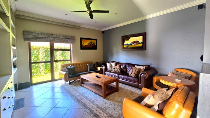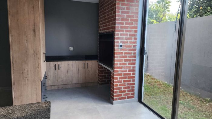 Secure lock-up-and-go sectional title living near Waterfall Mall — open-plan lounge and kitchen flowing to a covered patio with built-in braai and private yard; 3 beds, 3 baths, single garage.