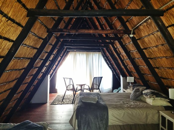 Wake up to dam and Magalies Mountains views in Utopia Nature Reserve; thatched two-story home with upstairs deck, open-plan living, solar power, one bedroom, one bathroom and covered parking.
