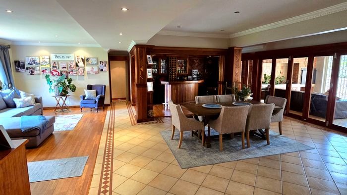 Entertainer's oasis with pool and sunlit patio in peaceful Cashan, Rustenburg, offering a chef’s kitchen with wood cupboards and granite counters, stylish bar, three bedrooms, three bathrooms and double garage.
