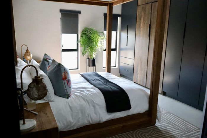 Secure, move-in-ready apartment in Waterfall East, Rustenburg — first-floor unit with private balcony, open-plan lounge and sleek kitchen, two bedrooms, two bathrooms, plus garage, carport and 24-hour security.