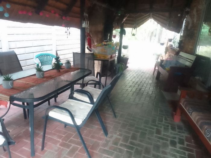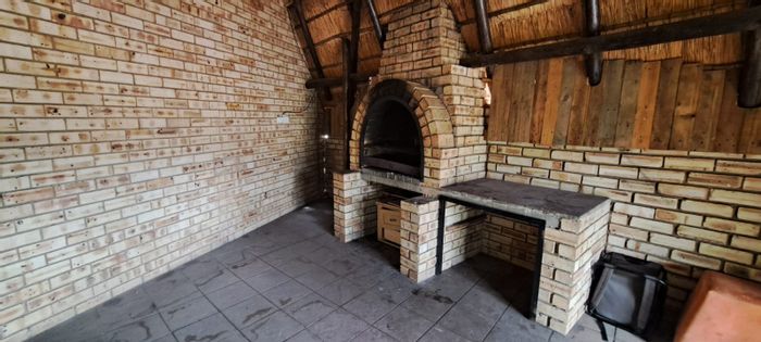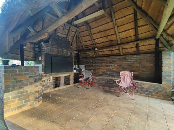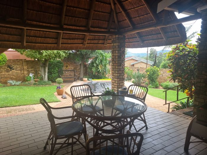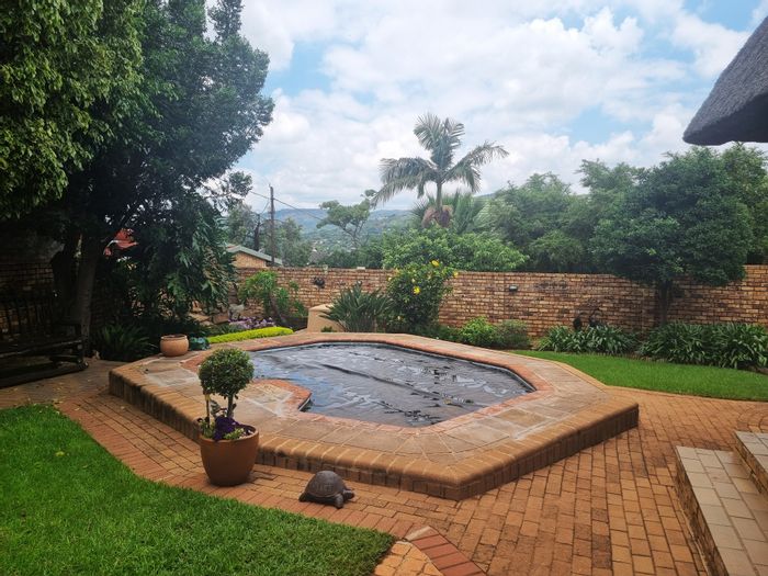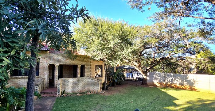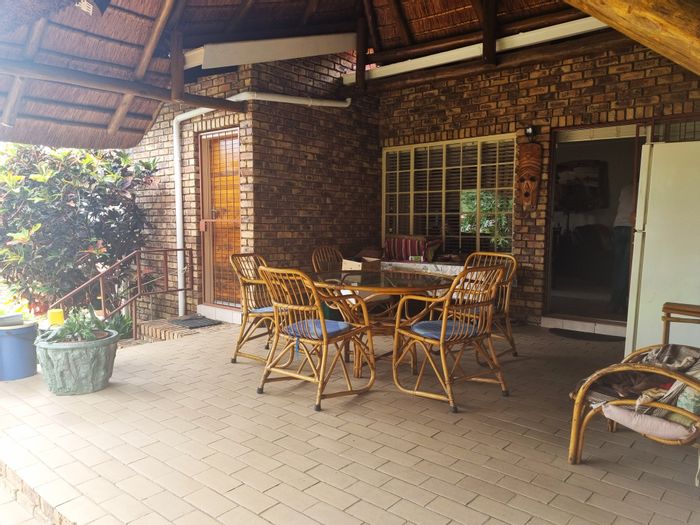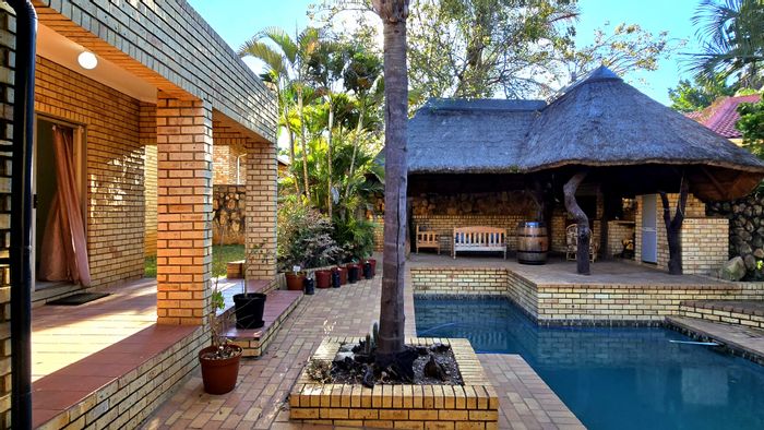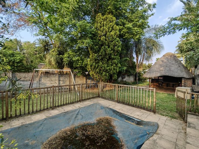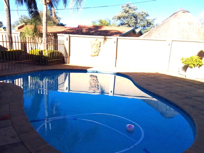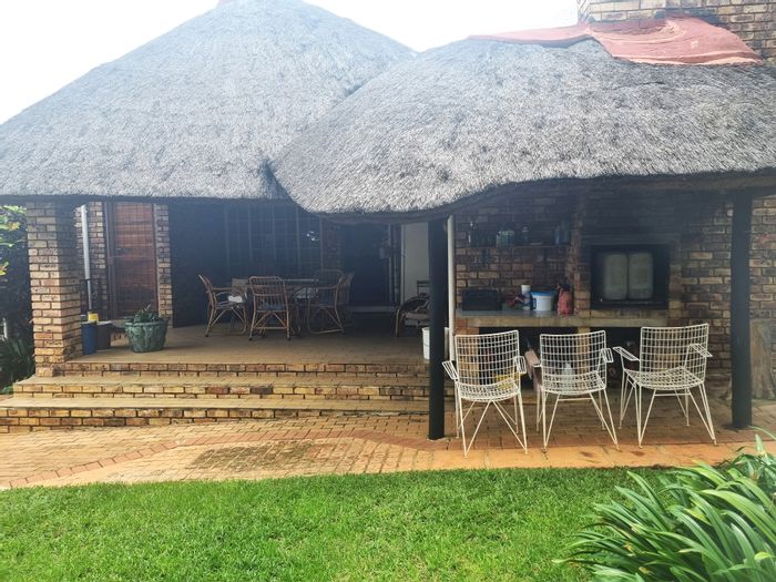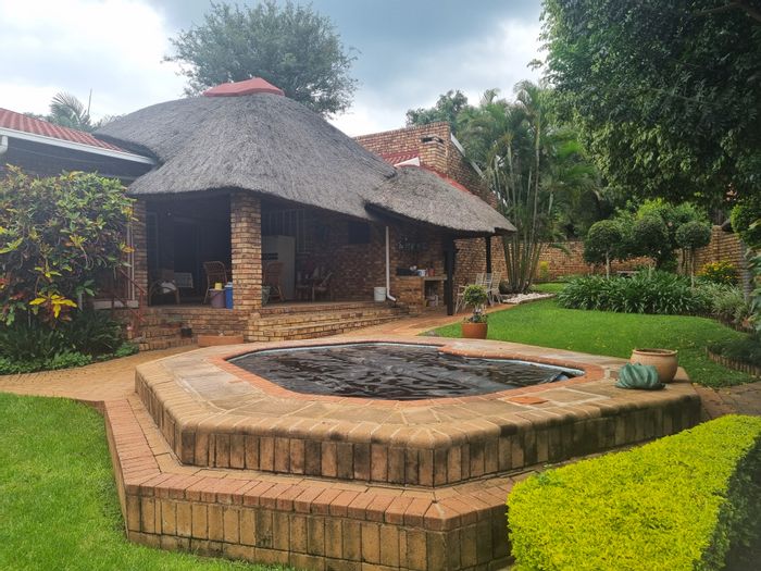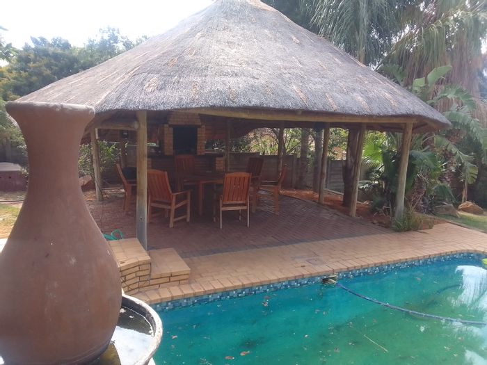 Relaxed family living in Geelhoutpark with lush garden and thatched patio with built-in braai overlooking a pool; open-plan kitchen, four bedrooms, two bathrooms, double garage.