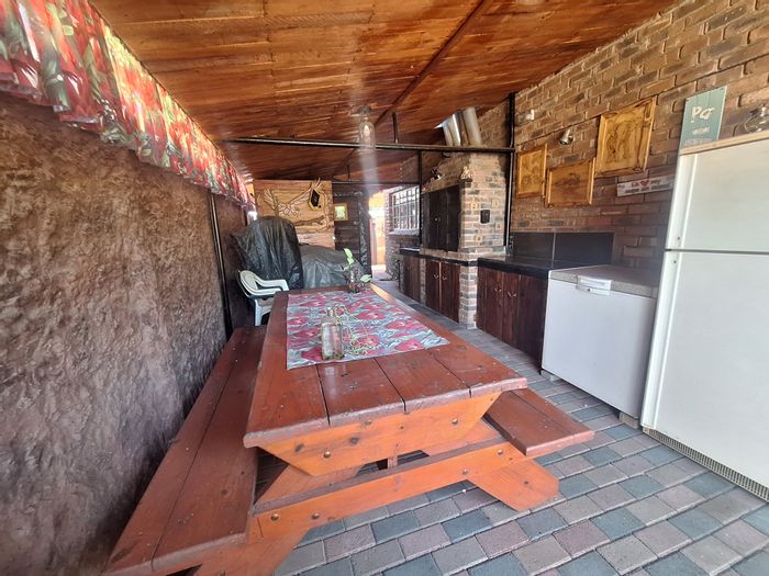 Relax and entertain on a covered patio within a generous 1,425 m² stand with irrigated gardens and Jojo tank; includes domestic quarters, workshop, 3 beds, 1 bath, carports for five.