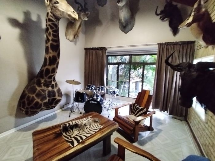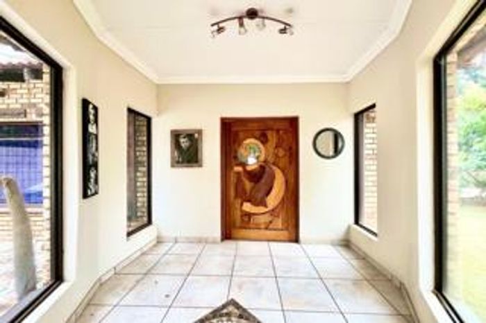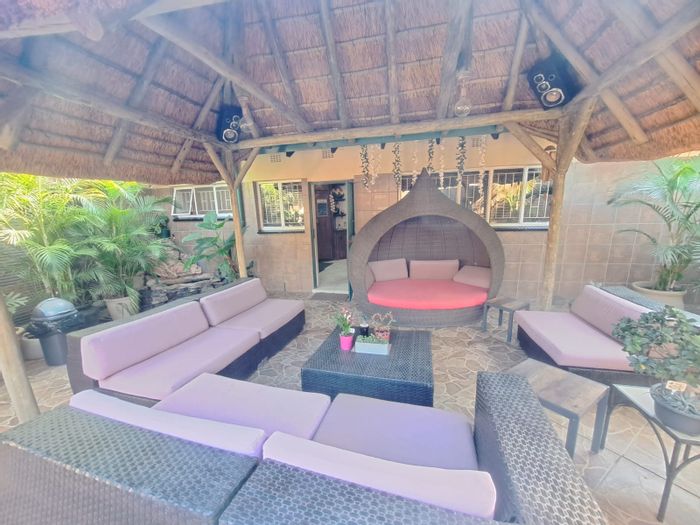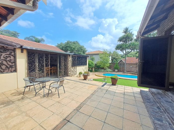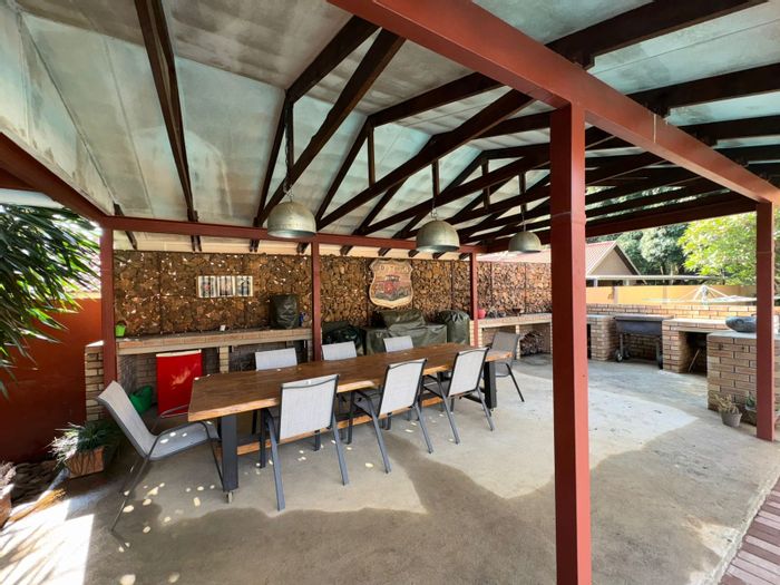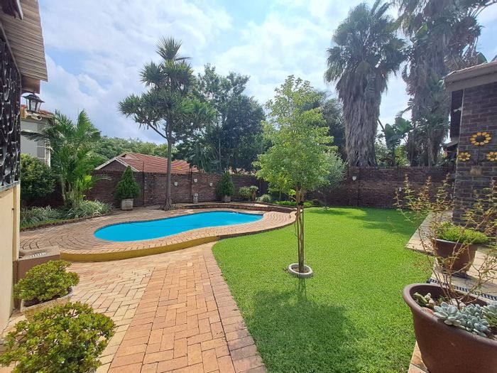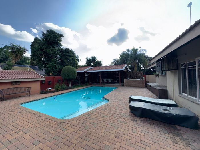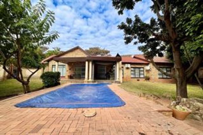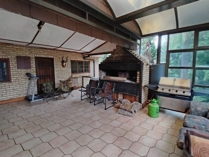 Entertainer's double-story home in prestigious Safari Gardens, steps from amenities — balcony with built-in braai, covered patio, entertainment room overlooking pool and expansive yard. Six bedrooms, four bathrooms.