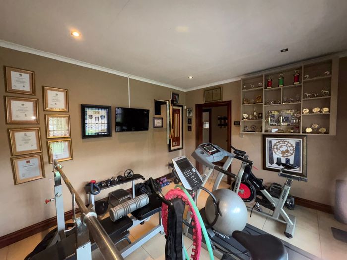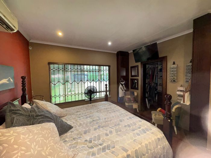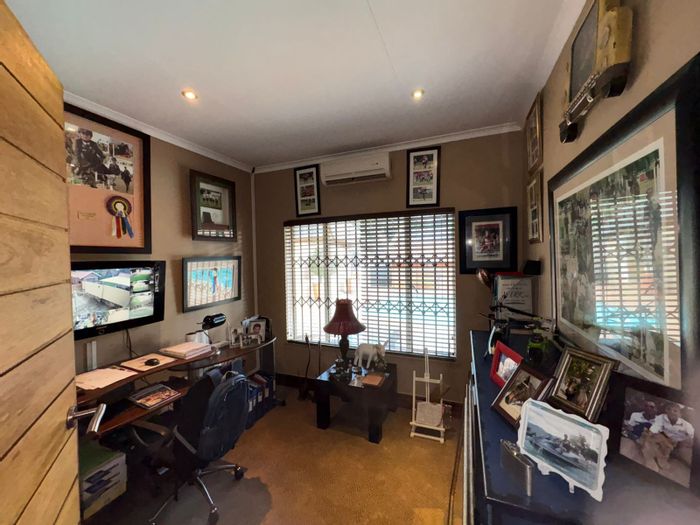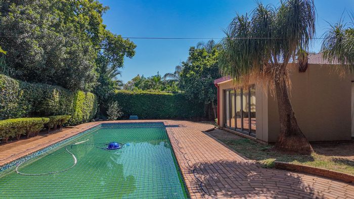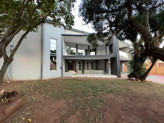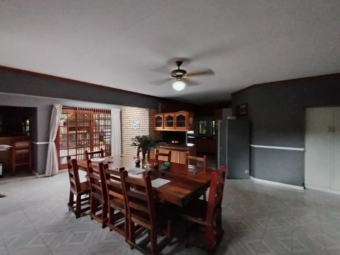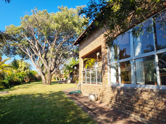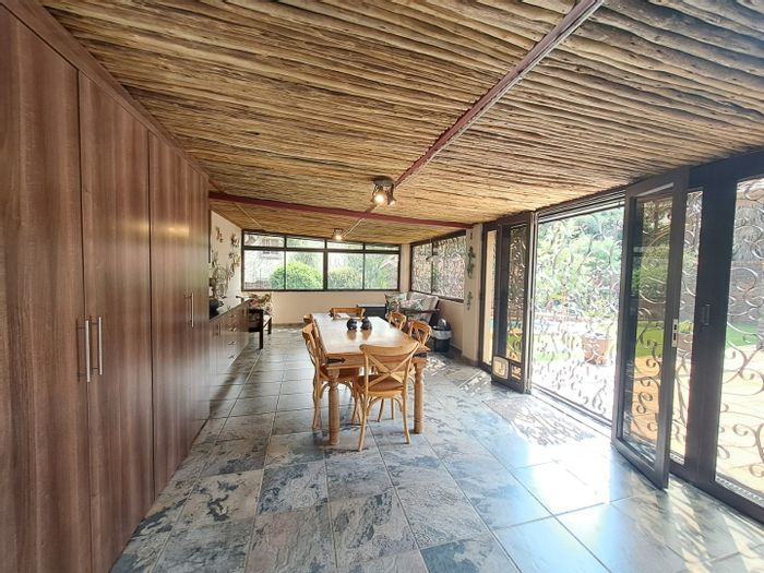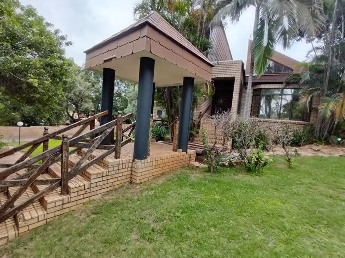 Entertainer's double-story home in prestigious Safari Gardens, steps from amenities — balcony with built-in braai, covered patio, entertainment room overlooking pool and expansive yard. Six bedrooms, four bathrooms.