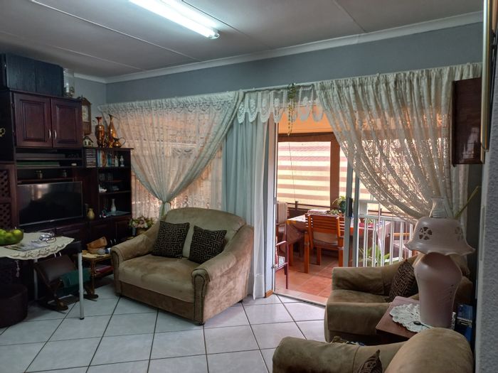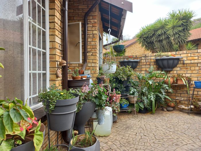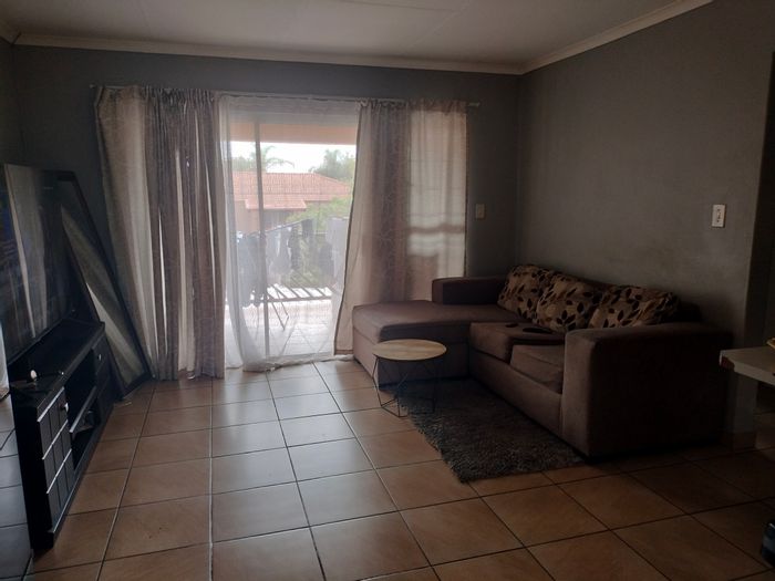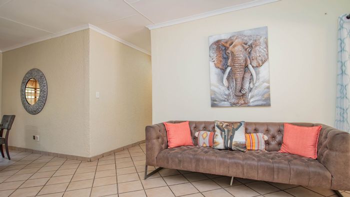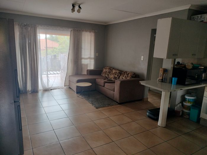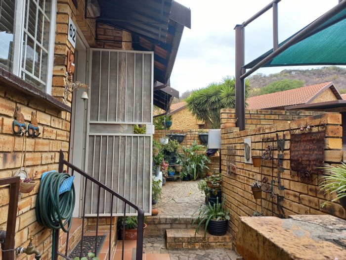 Relaxed community living with poolside weekends and garden gatherings in Safari Gardens, Rustenburg, featuring open-plan tiled interiors, picturesque views, and three bedrooms, two bathrooms with covered parking.