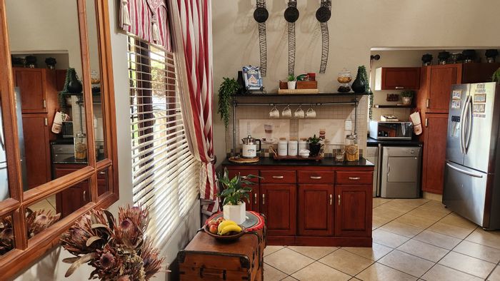 Relaxed family living in sought-after Waterval East estate, near amenities, featuring open-plan living, custom wooden cabinetry and scullery, covered patio with built-in braai and jacuzzi; three beds, two baths.