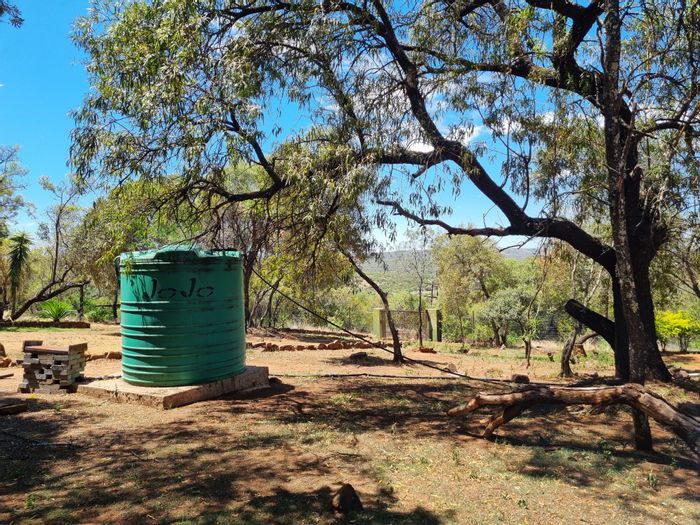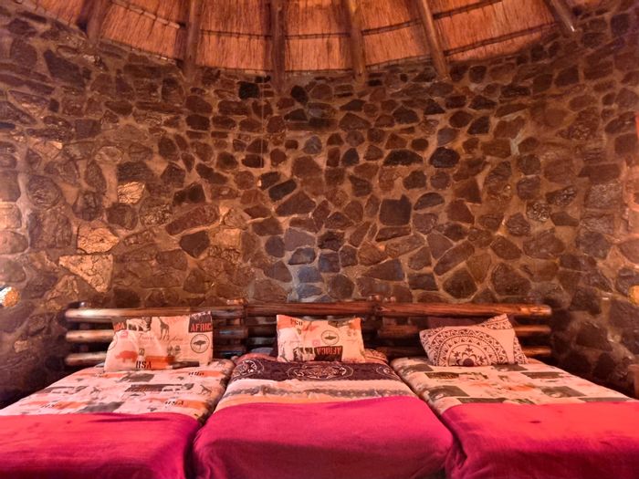 Mountain-top 22.44‑ha retreat near Swartruggens, 4 km from Ventersdorp Road — stone and log homes with panoramic dam views, convertible cabins, borehole and solar power.