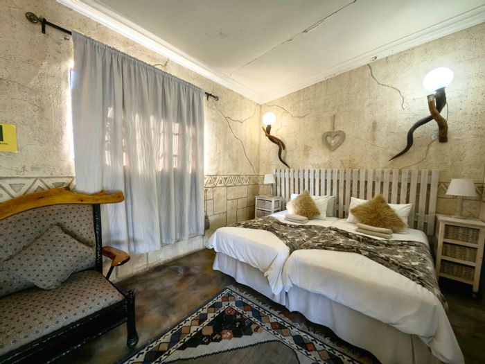 Mountain-top 22.44‑ha retreat near Swartruggens, 4 km from Ventersdorp Road — stone and log homes with panoramic dam views, convertible cabins, borehole and solar power.