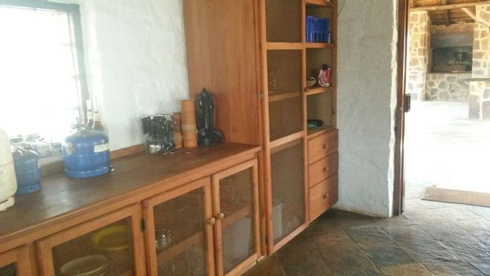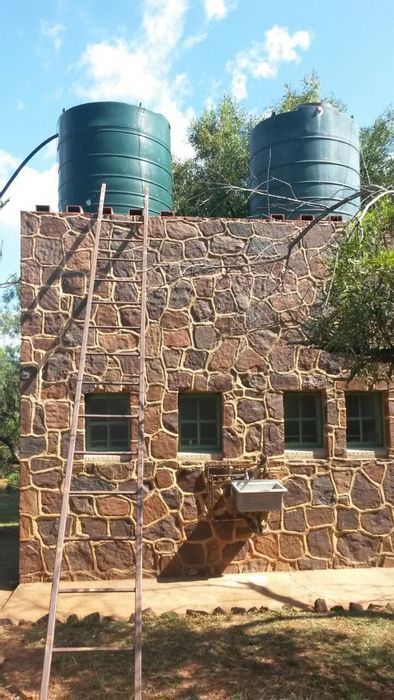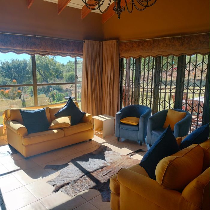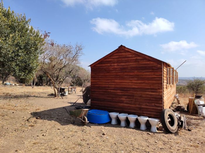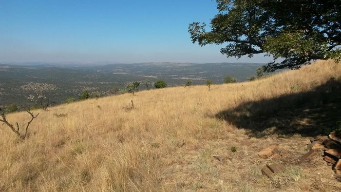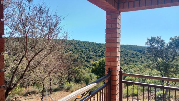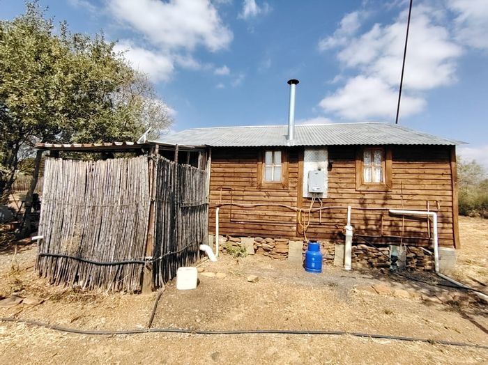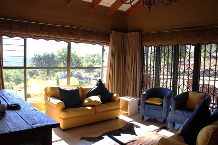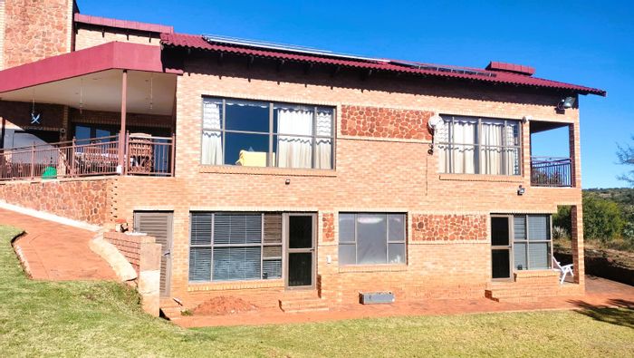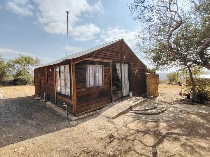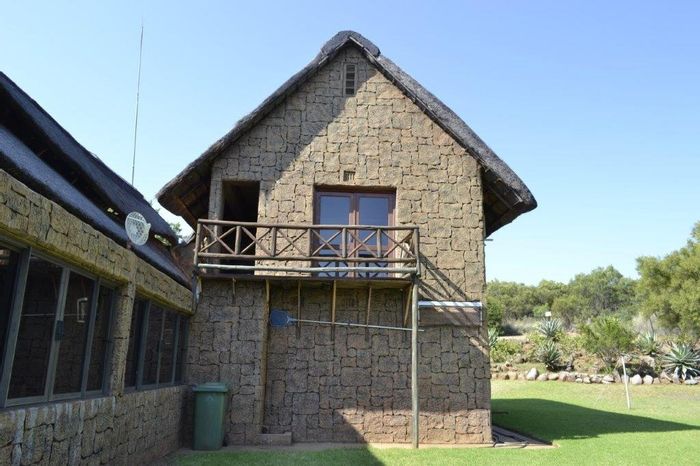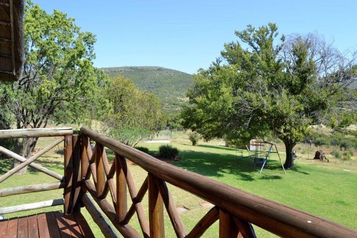 Mountain-top 22.44‑ha retreat near Swartruggens, 4 km from Ventersdorp Road — stone and log homes with panoramic dam views, convertible cabins, borehole and solar power.