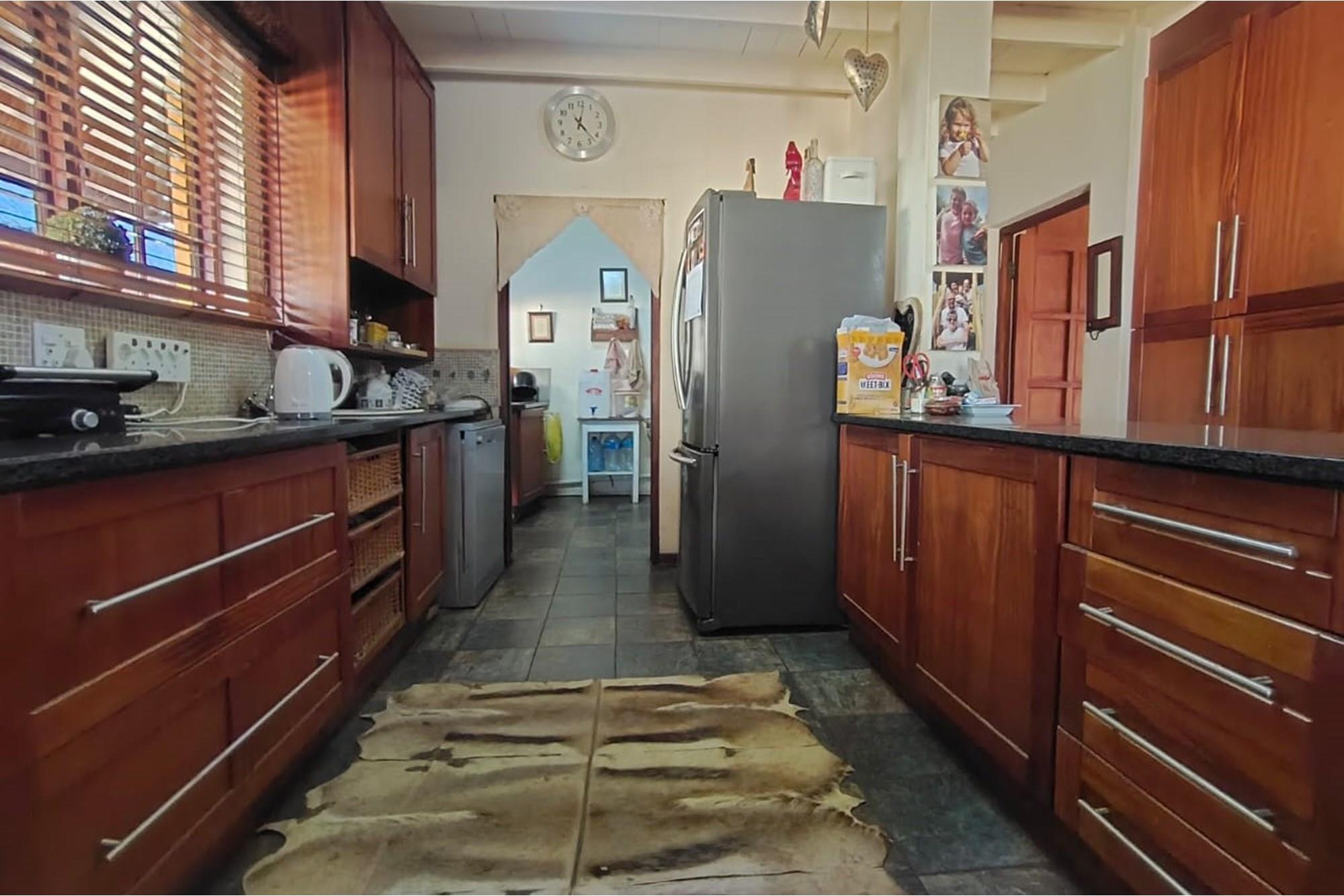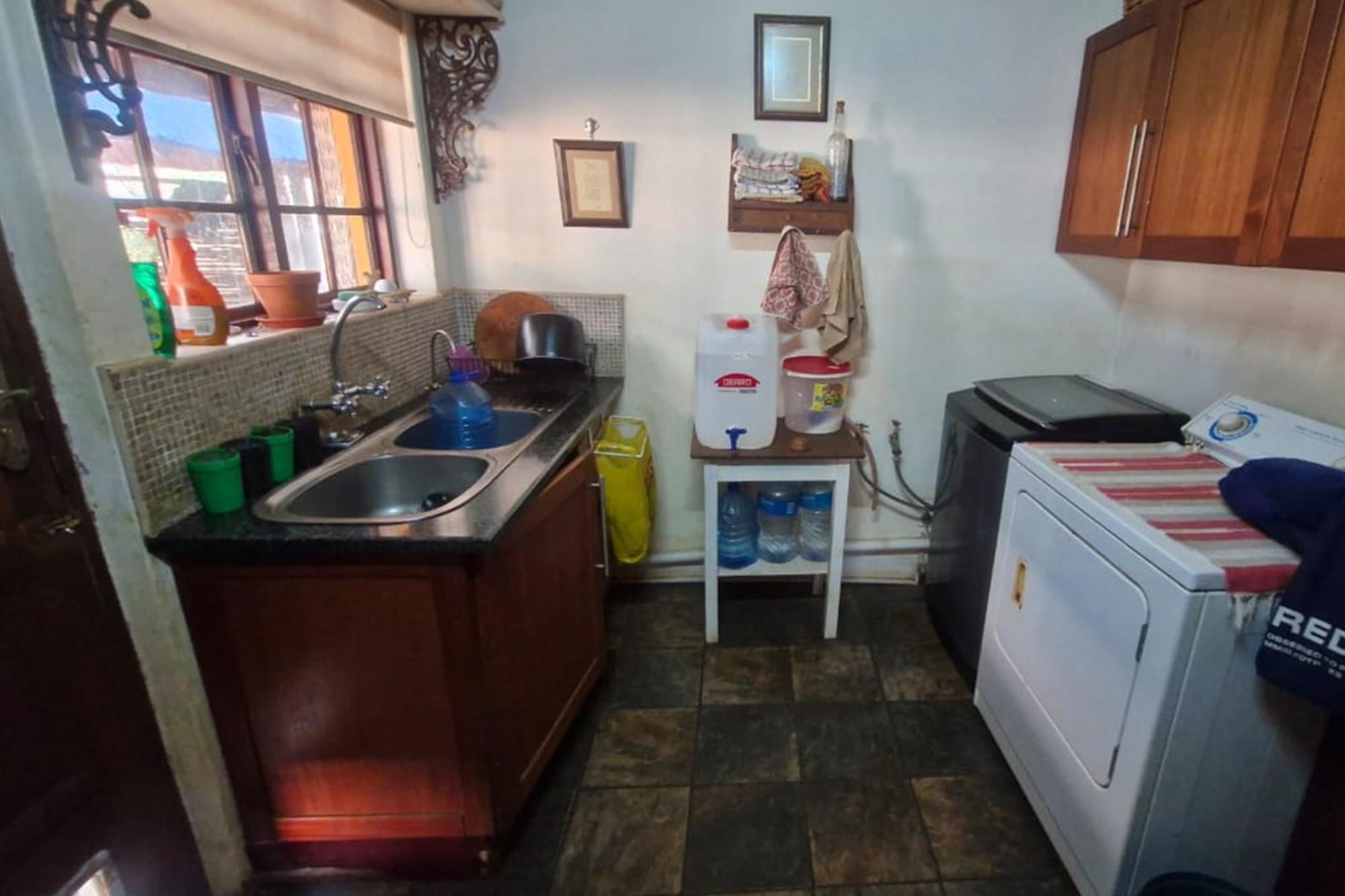 Double volume living and dining room with a cozy fireplace and open plan kitchen with an adjoining scullery with laundry facilities.