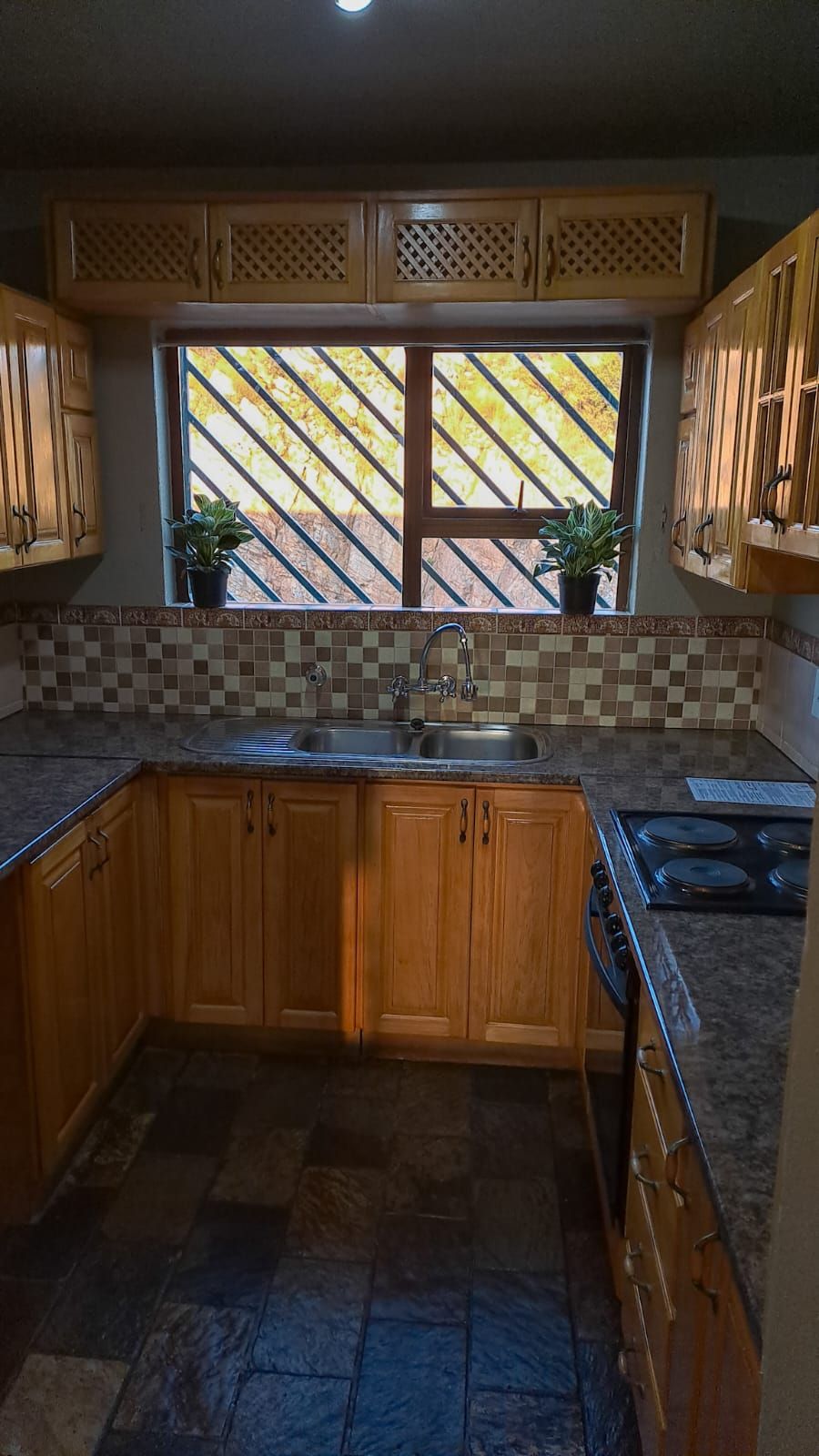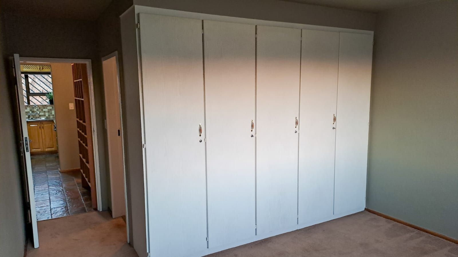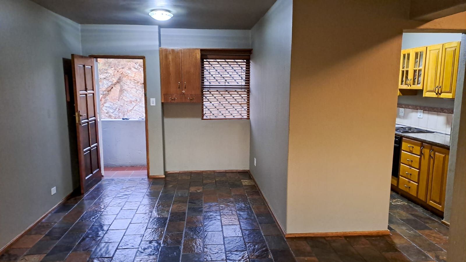 The modern kitchen is fitted with solid wooden units, granite countertops, and space for both a fridge and washing machine. Two well-proportioned bedrooms offer ample built-in cupboards – the main bedroom carpeted for comfort, and the second tiled for easy living. Both bathrooms have been tastefully renovated.