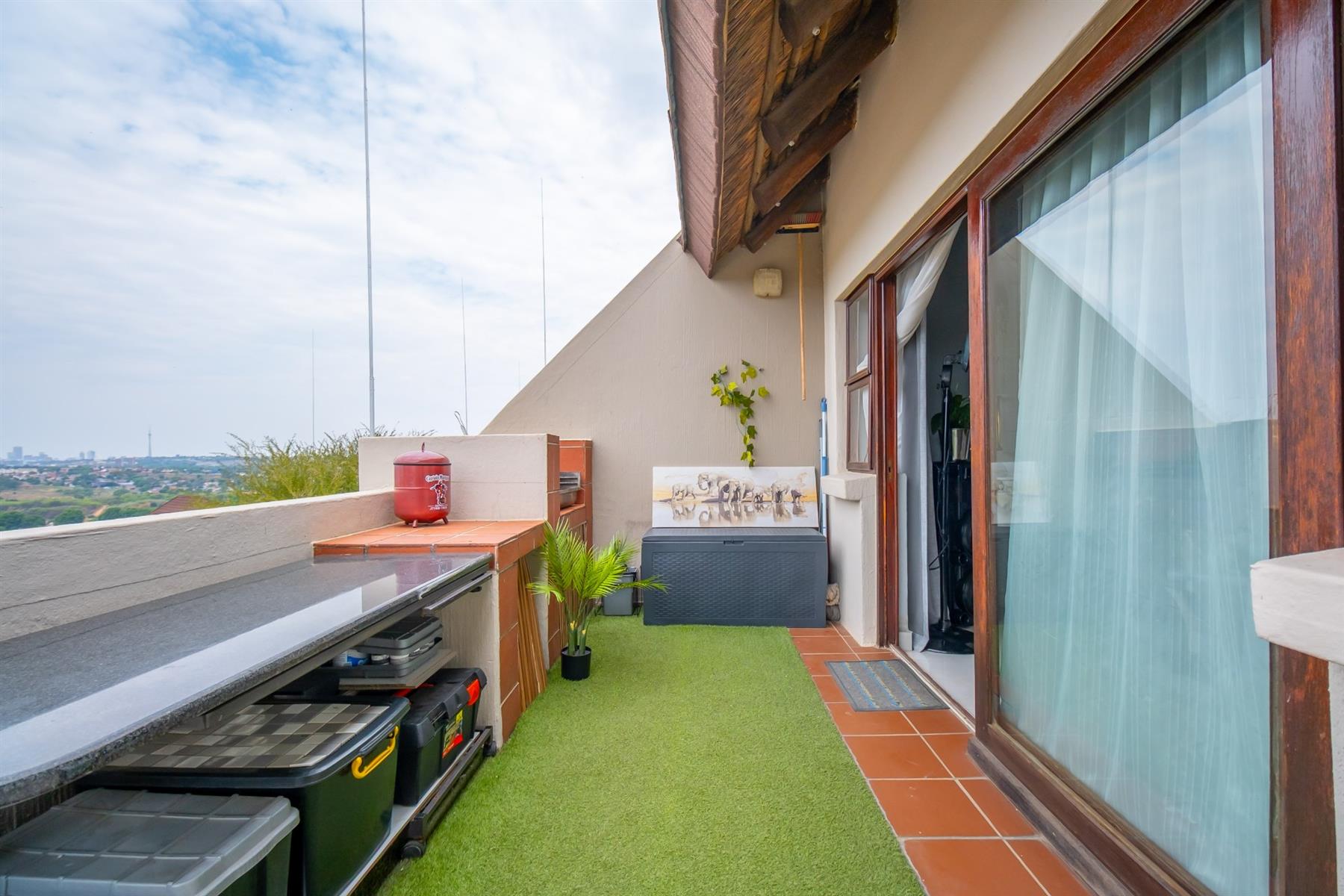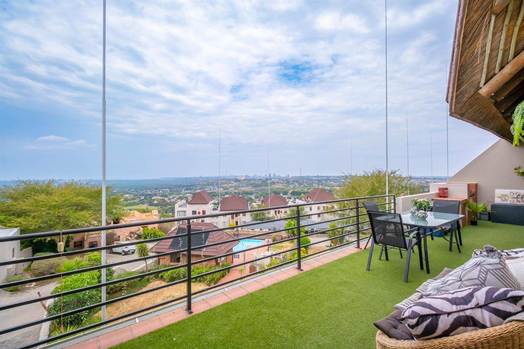 The open-plan kitchen, dining and living area is generous without being ostentatious - ideal for relaxed evenings, a quiet dinner, or simply catching your breath after the workday. Sliding doors open onto a wide balcony, where the views are nothing short of cinematic. From here, the eastern skyline unfolds - Sandton, Rosebank, the Johannesburg CBD - all framed by treetops and stretching out to the horizon. It’s a perspective that shifts from soft daylight to city sparkle as the sun goes down.